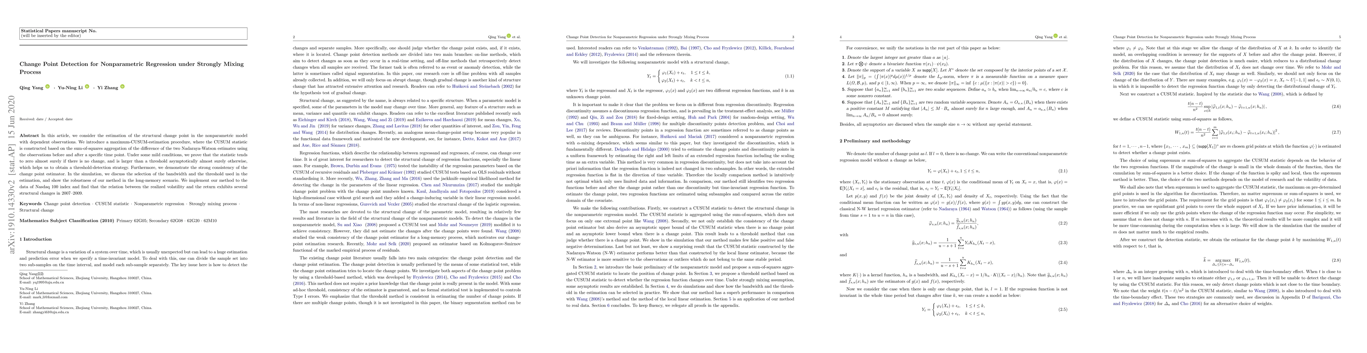 This paper proposes a maximum-CUSUM-estimation procedure for detecting structural change points in nonparametric regression models with strongly mixing processes. The method uses Nadaraya-Watson estimates and demonstrates strong consistency and robustness, as shown through simulations and an application to Nasdaq 100 index data revealing structural changes in volatility-return relationships during 2007-2009.