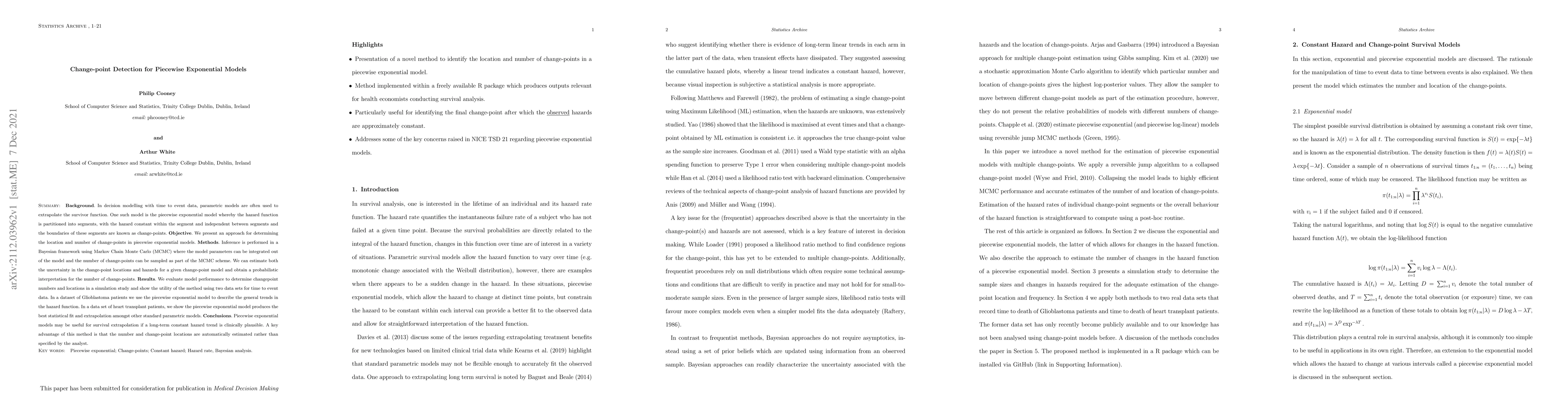 This paper proposes a Bayesian approach for detecting change-points in piecewise exponential models used in time-to-event data analysis. It utilizes Markov Chain Monte Carlo (MCMC) to estimate change-point locations and number, providing probabilistic interpretations and demonstrating utility through simulations and real-world data from Glioblastoma and heart transplant patients.