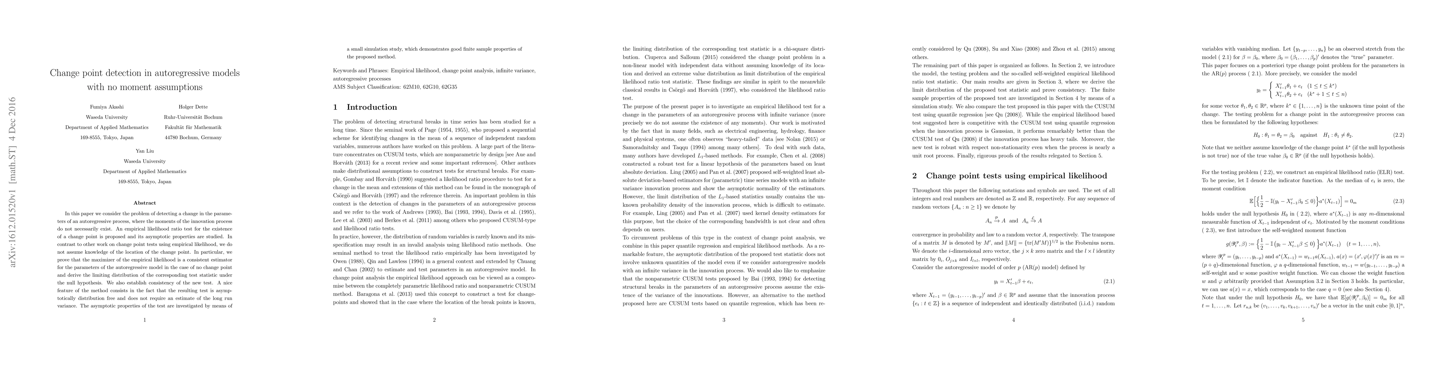 This paper proposes an empirical likelihood ratio test for detecting a change point in autoregressive models without requiring moment assumptions. The method is shown to be consistent and asymptotically distribution-free, with a small simulation study demonstrating its good finite sample performance.