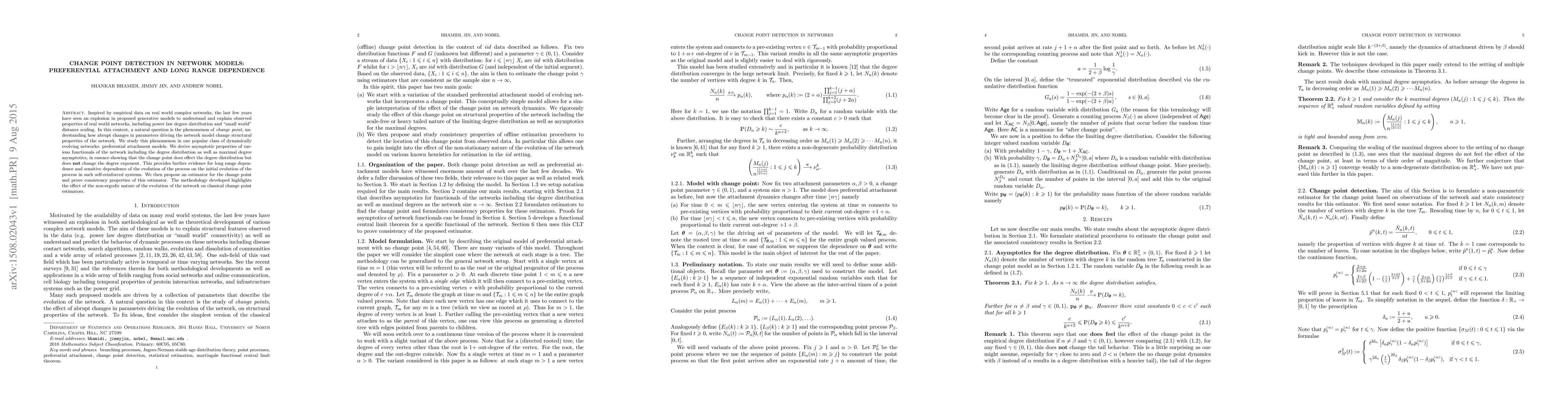 This paper investigates change point detection in preferential attachment models, demonstrating that while changes in parameters affect the degree distribution, they do not alter the degree exponent, supporting long-range dependence. An estimator for the change point is proposed and shown to be consistent, highlighting the non-ergodic nature of network evolution.