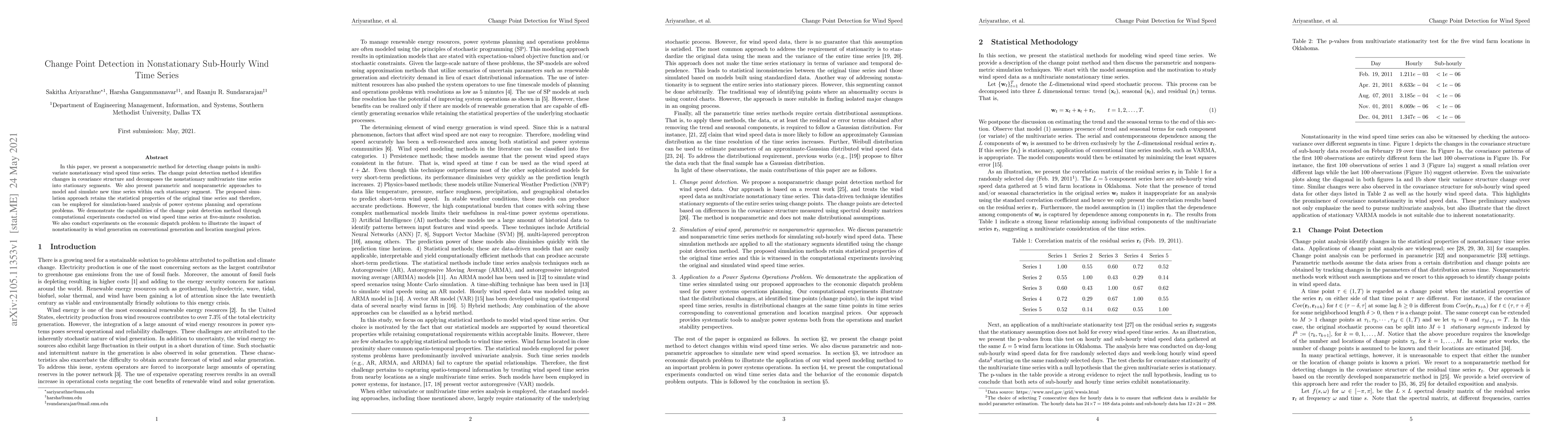 In this paper, we present a change point detection method for detecting change points in multivariate nonstationary wind speed time series. The change point method identifies changes in the covariance structure and decomposes the nonstationary multivariate time series into stationary segments. We also present parametric and nonparametric simulation techniques to simulate new wind time series within each stationary segment. The proposed simulation methods retain statistical properties of the original time series and therefore, can be employed for simulation-based analysis of power systems planning and operations problems. We demonstrate the capabilities of the change point detection method through computational experiments conducted on wind speed time series at five-minute resolution. We also conduct experiments on the economic dispatch problem to illustrate the impact of nonstationarity in wind generation on conventional generation and location marginal prices.