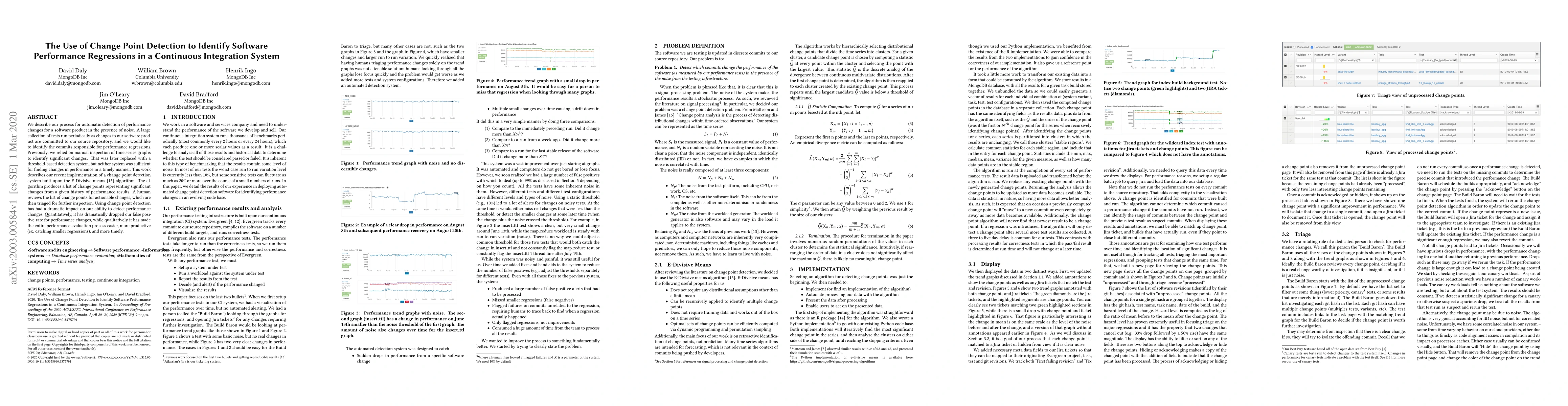 This paper presents a new automatic change point detection system using the E-Divisive means algorithm to identify performance regressions in software testing. The system has significantly reduced false positives and improved the efficiency and timeliness of performance evaluation compared to previous manual and threshold-based methods.