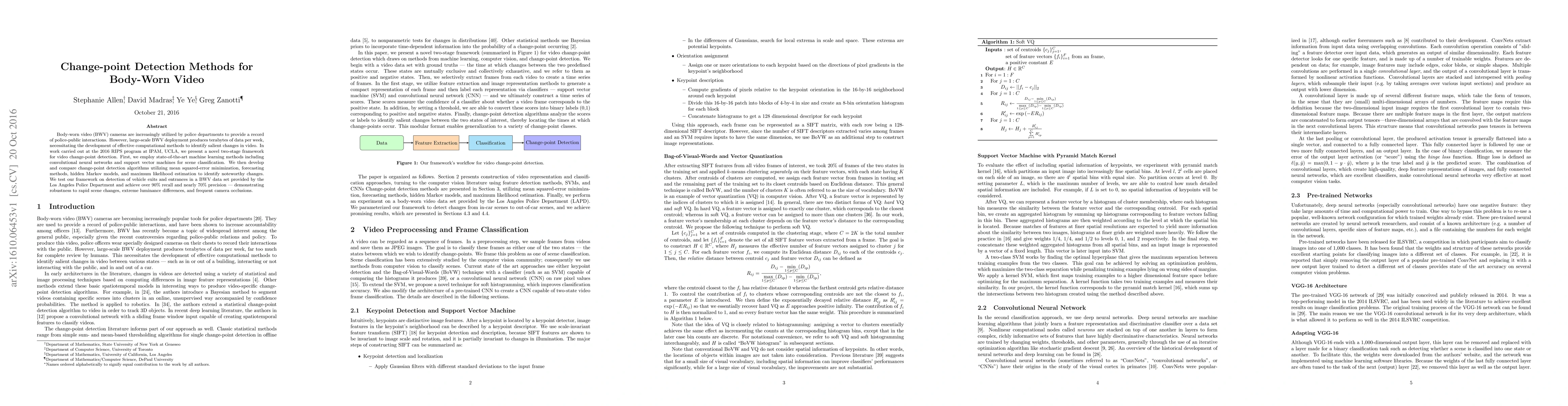 Body-worn video (BWV) cameras are increasingly utilized by police departments to provide a record of police-public interactions. However, large-scale BWV deployment produces terabytes of data per week, necessitating the development of effective computational methods to identify salient changes in video. In work carried out at the 2016 RIPS program at IPAM, UCLA, we present a novel two-stage framework for video change-point detection. First, we employ state-of-the-art machine learning methods including convolutional neural networks and support vector machines for scene classification. We then develop and compare change-point detection algorithms utilizing mean squared-error minimization, forecasting methods, hidden Markov models, and maximum likelihood estimation to identify noteworthy changes. We test our framework on detection of vehicle exits and entrances in a BWV data set provided by the Los Angeles Police Department and achieve over 90% recall and nearly 70% precision -- demonstrating robustness to rapid scene changes, extreme luminance differences, and frequent camera occlusions.
