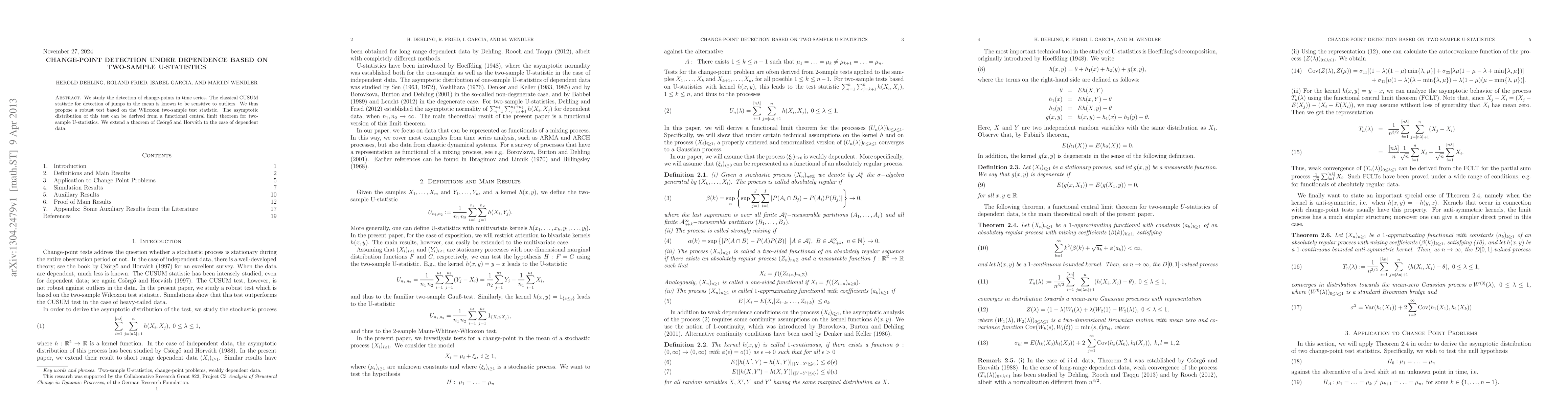 Summary: This research proposes a robust change-point detection method using the Wilcoxon two-sample test statistic for time series data, addressing the sensitivity of traditional CUSUM statistics to outliers. The method leverages the asymptotic distribution derived from a functional central limit theorem for two-sample U-statistics and extends existing theory for dependent data.