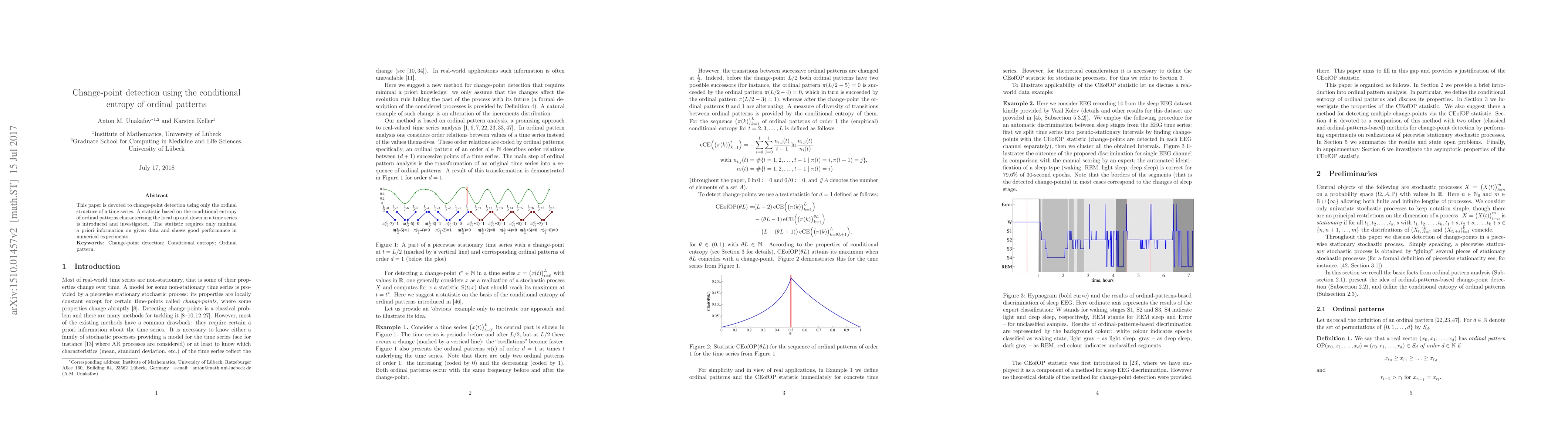 This paper introduces a change-point detection method based on the conditional entropy of ordinal patterns in time series, requiring minimal a priori information and demonstrating effective performance in experiments.