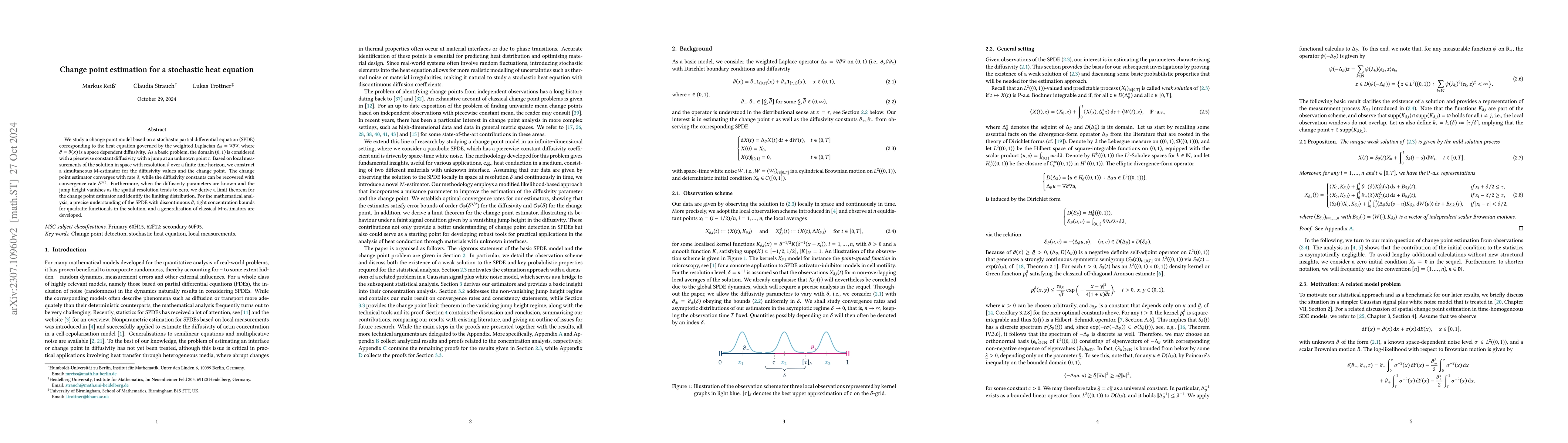 We study a change point model based on a stochastic partial differential equation (SPDE) corresponding to the heat equation governed by the weighted Laplacian $\Delta_\vartheta = \nabla\vartheta\nabla$, where $\vartheta=\vartheta(x)$ is a space-dependent diffusivity. As a basic problem the domain $(0,1)$ is considered with a piecewise constant diffusivity with a jump at an unknown point $\tau$. Based on local measurements of the solution in space with resolution $\delta$ over a finite time horizon, we construct a simultaneous M-estimator for the diffusivity values and the change point. The change point estimator converges at rate $\delta$, while the diffusivity constants can be recovered with convergence rate $\delta^{3/2}$. Moreover, when the diffusivity parameters are known and the jump height vanishes with the spatial resolution tending to zero, we derive a limit theorem for the change point estimator and identify the limiting distribution. For the mathematical analysis, a precise understanding of the SPDE with discontinuous $\vartheta$, tight concentration bounds for quadratic functionals in the solution, and a generalisation of classical M-estimators are developed.