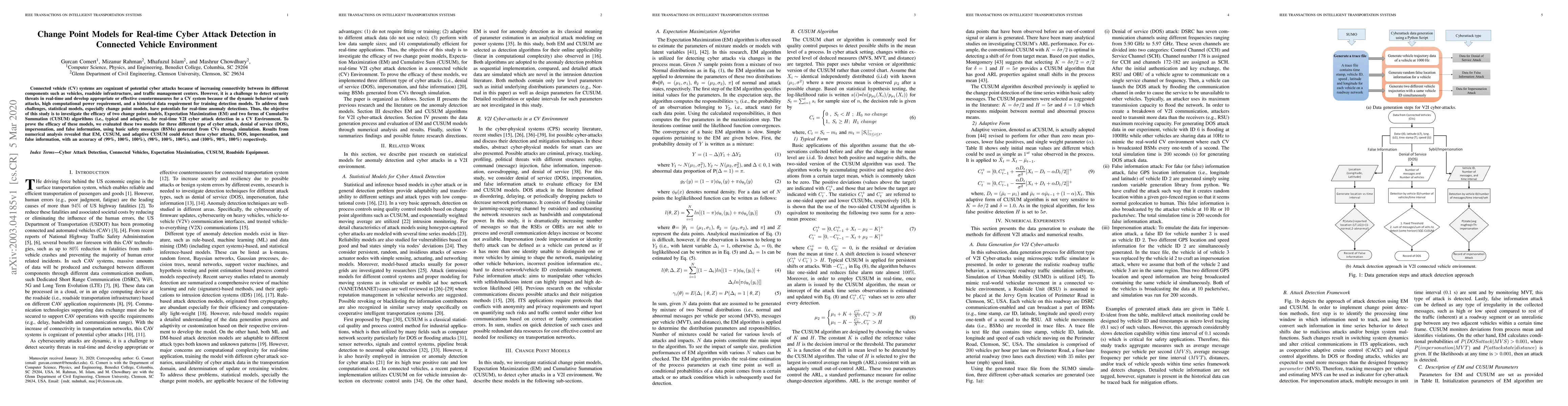 This study investigates the efficacy of change point models, specifically Expectation Maximization (EM) and Cumulative Summation (CUSUM) algorithms, for real-time cyber attack detection in connected vehicle environments. Results from simulations show that these models can effectively detect denial of service, impersonation, and false information attacks with high accuracy.