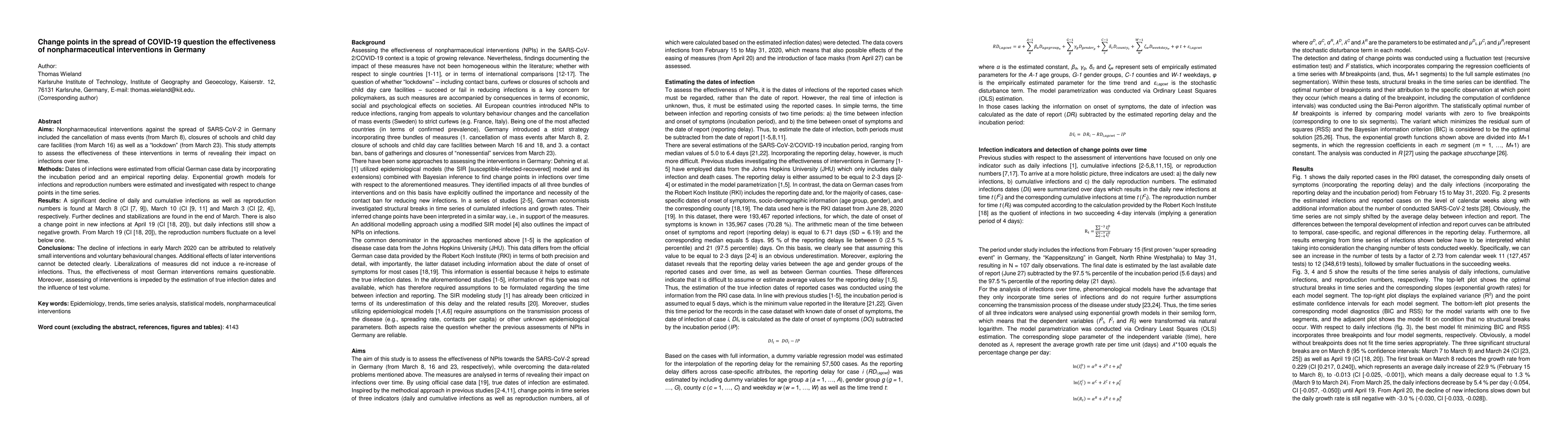 Aims: Nonpharmaceutical interventions against the spread of SARS-CoV-2 in Germany included the cancellation of mass events (from March 8), closures of schools and child day care facilities (from March 16) as well as a "lockdown" (from March 23). This study attempts to assess the effectiveness of these interventions in terms of revealing their impact on infections over time. Methods: Dates of infections were estimated from official German case data by incorporating the incubation period and an empirical reporting delay. Exponential growth models for infections and reproduction numbers were estimated and investigated with respect to change points in the time series. Results: A significant decline of daily and cumulative infections as well as reproduction numbers is found at March 8 (CI [7, 9]), March 10 (CI [9, 11] and March 3 (CI [2, 4]), respectively. Further declines and stabilizations are found in the end of March. There is also a change point in new infections at April 19 (CI [18, 20]), but daily infections still show a negative growth. From March 19 (CI [18, 20]), the reproduction numbers fluctuate on a level below one. Conclusions: The decline of infections in early March 2020 can be attributed to relatively small interventions and voluntary behavioural changes. Additional effects of later interventions cannot be detected clearly. Liberalizations of measures did not induce a re-increase of infections. Thus, the effectiveness of most German interventions remains questionable. Moreover, assessing of interventions is impeded by the estimation of true infection dates and the influence of test volume.