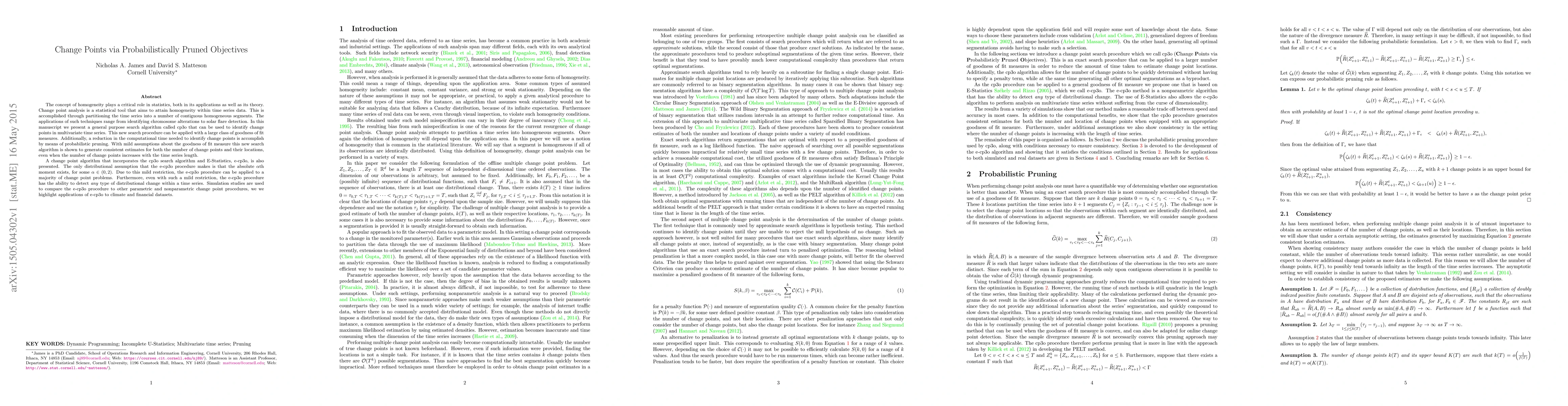 The concept of homogeneity plays a critical role in statistics, both in its applications as well as its theory. Change point analysis is a statistical tool that aims to attain homogeneity within time series data. This is accomplished through partitioning the time series into a number of contiguous homogeneous segments. The applications of such techniques range from identifying chromosome alterations to solar flare detection. In this manuscript we present a general purpose search algorithm called cp3o that can be used to identify change points in multivariate time series. This new search procedure can be applied with a large class of goodness of fit measures. Additionally, a reduction in the computational time needed to identify change points is accomplish by means of probabilistic pruning. With mild assumptions about the goodness of fit measure this new search algorithm is shown to generate consistent estimates for both the number of change points and their locations, even when the number of change points increases with the time series length. A change point algorithm that incorporates the cp3o search algorithm and E-Statistics, e-cp3o, is also presented. The only distributional assumption that the e-cp3o procedure makes is that the absolute $\alpha$th moment exists, for some $\alpha\in(0,2)$. Due to this mild restriction, the e-cp3o procedure can be applied to a majority of change point problems. Furthermore, even with such a mild restriction, the e-cp3o procedure has the ability to detect any type of distributional change within a time series. Simulation studies are used to compare the e-cp3o procedure to other parametric and nonparametric change point procedures, we highlight applications of e-cp3o to climate and financial datasets.