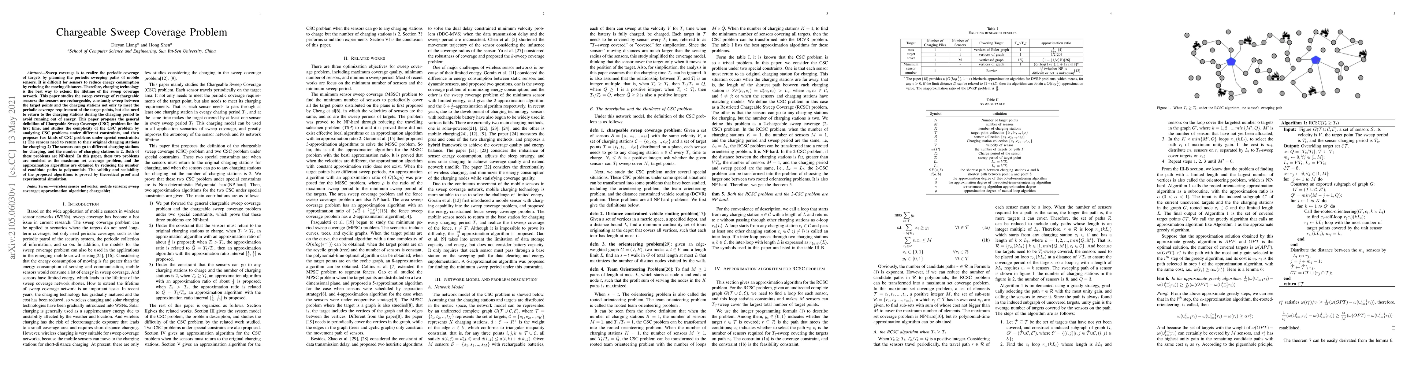 This paper introduces the Chargeable Sweep Coverage (CSC) problem, focusing on rechargeable sensors that must periodically sweep targets while returning to charging stations to avoid energy depletion. It proposes two NP-hard CSC variants under different charging constraints and models them as maximum set coverage problems, providing approximation algorithms with proven validity and scalability.