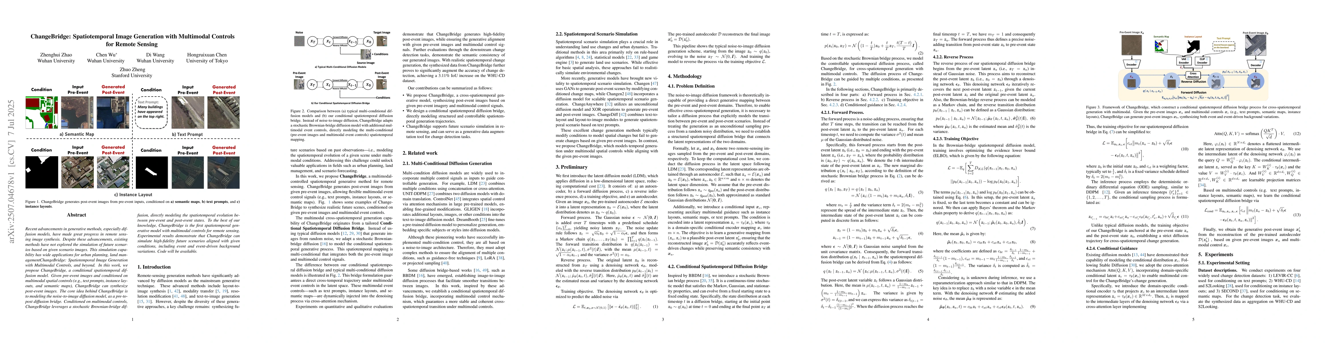 The research introduces ChangeBridge, a conditional spatiotemporal diffusion model for remote sensing image synthesis, which simulates future scenarios based on given scenario images using multimodal spatial controls such as text prompts, instance layouts, and semantic maps.