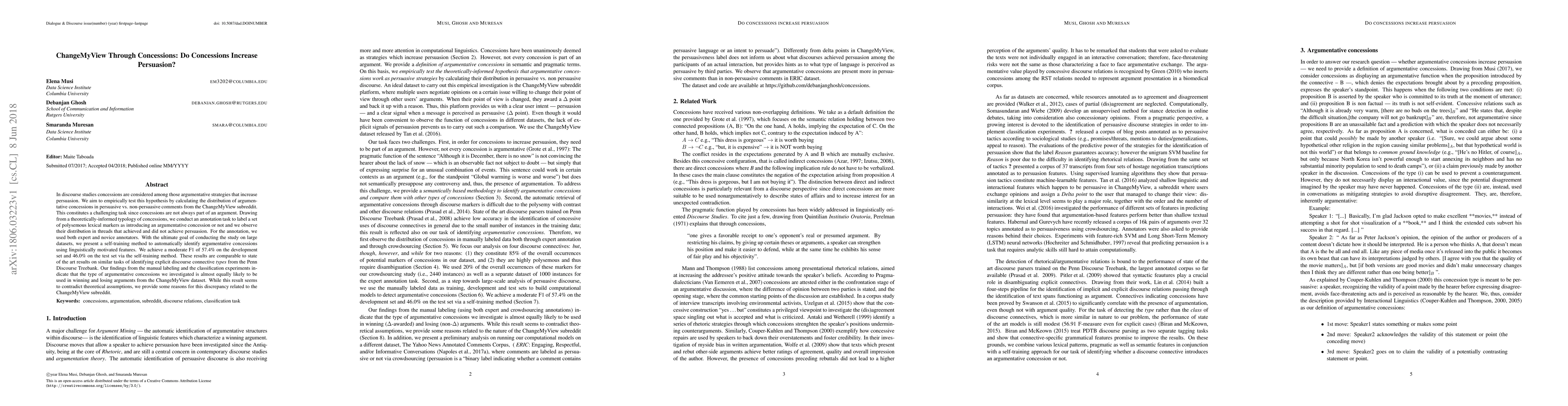 In discourse studies concessions are considered among those argumentative strategies that increase persuasion. We aim to empirically test this hypothesis by calculating the distribution of argumentative concessions in persuasive vs. non-persuasive comments from the ChangeMyView subreddit. This constitutes a challenging task since concessions are not always part of an argument. Drawing from a theoretically-informed typology of concessions, we conduct an annotation task to label a set of polysemous lexical markers as introducing an argumentative concession or not and we observe their distribution in threads that achieved and did not achieve persuasion. For the annotation, we used both expert and novice annotators. With the ultimate goal of conducting the study on large datasets, we present a self-training method to automatically identify argumentative concessions using linguistically motivated features. We achieve a moderate F1 of 57.4% on the development set and 46.0% on the test set via the self-training method. These results are comparable to state of the art results on similar tasks of identifying explicit discourse connective types from the Penn Discourse Treebank. Our findings from the manual labeling and the classification experiments indicate that the type of argumentative concessions we investigated is almost equally likely to be used in winning and losing arguments from the ChangeMyView dataset. While this result seems to contradict theoretical assumptions, we provide some reasons for this discrepancy related to the ChangeMyView subreddit.