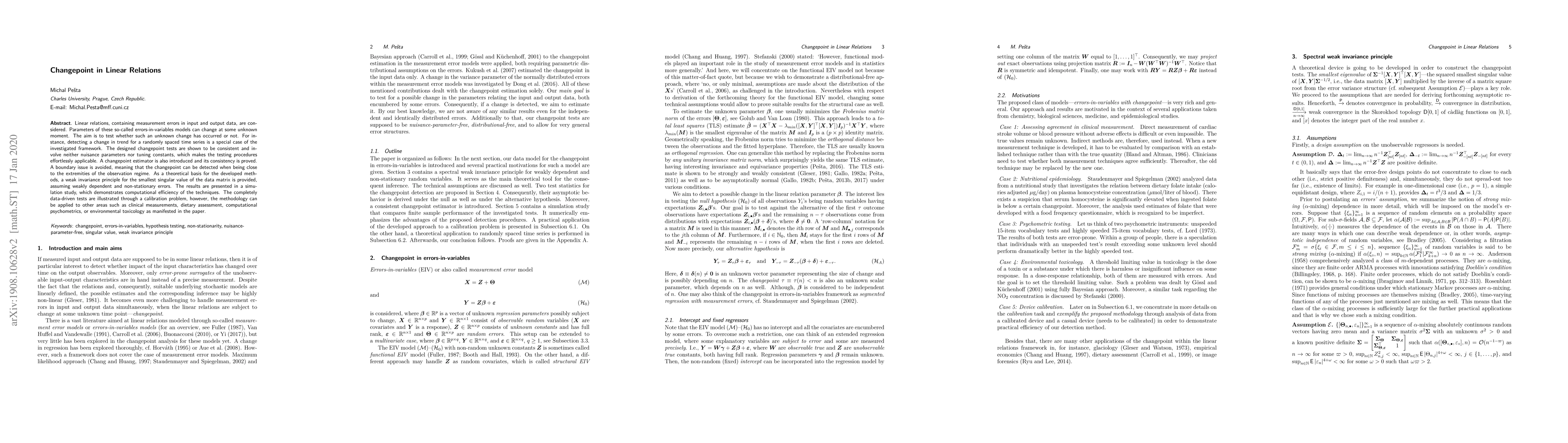 Linear relations, containing measurement errors in input and output data, are considered. Parameters of these so-called errors-in-variables models can change at some unknown moment. The aim is to test whether such an unknown change has occurred or not. For instance, detecting a change in trend for a randomly spaced time series is a special case of the investigated framework. The designed changepoint tests are shown to be consistent and involve neither nuisance parameters nor tuning constants, which makes the testing procedures effortlessly applicable. A changepoint estimator is also introduced and its consistency is proved. A boundary issue is avoided, meaning that the changepoint can be detected when being close to the extremities of the observation regime. As a theoretical basis for the developed methods, a weak invariance principle for the smallest singular value of the data matrix is provided, assuming weakly dependent and non-stationary errors. The results are presented in a simulation study, which demonstrates computational efficiency of the techniques. The completely data-driven tests are illustrated through a calibration problem, however, the methodology can be applied to other areas such as clinical measurements, dietary assessment, computational psychometrics, or environmental toxicology as manifested in the paper.