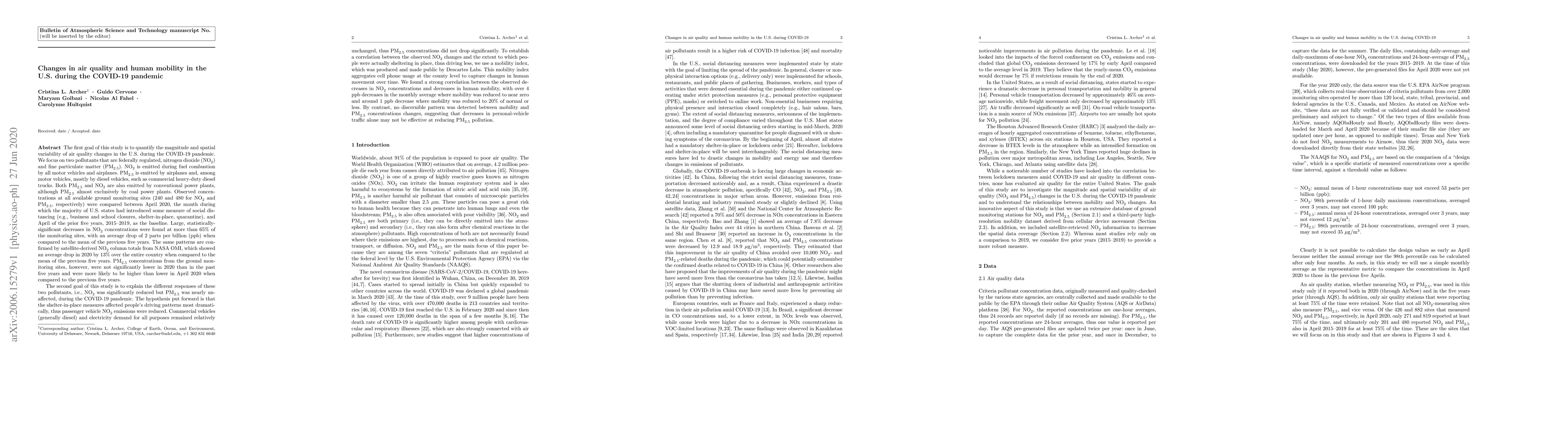 This study quantifies significant decreases in nitrogen dioxide (NO2) but not fine particulate matter (PM2.5) in the U.S. during the COVID-19 pandemic, attributing the NO2 drop to reduced passenger vehicle emissions due to shelter-in-place measures, while PM2.5 remained high due to unchanged commercial activity and electricity demand.