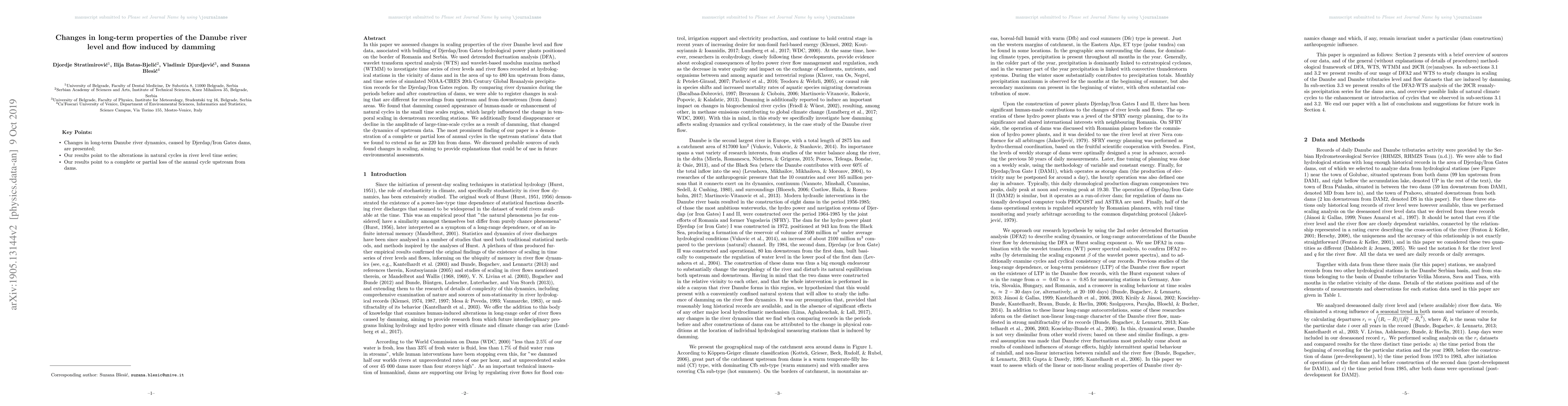 In this paper we assessed changes in scaling properties of the river Danube level and flow data, associated with building of Djerdap/Iron Gates hydrological power plants positioned on the border of Romania and Serbia. We used detrended fluctuation analysis (DFA), wavelet transform spectral analysis (WTS) and wavelet-based modulus maxima method (WTMM) to investigate time series of river levels and river flows recorded at hydrological stations in the vicinity of dams and in the area of up to 480 km upstream from dams, and time series of simulated NOAA-CIRES 20th Century Global Reanalysis precipitation records for the Djerdap/Iron Gates region. By comparing river dynamics during the periods before and after construction of dams, we were able to register changes in scaling that are different for recordings from upstream and from downstream (from dams) areas. We found that damming caused appearance of human-made or enhancement of natural cycles in the small time scales region, which largely influenced the change in temporal scaling in downstream recording stations. We additionally found disappearance or decline in the amplitude of large-time-scale cycles as a result of damming, that changed the dynamics of upstream data. The most prominent finding of our paper is a demonstration of a complete or partial loss of annual cycles in the upstream stations' data that we found to extend as far as 220 km from dams. We discussed probable sources of such found changes in scaling, aiming to provide explanations that could be of use in future environmental assessments.