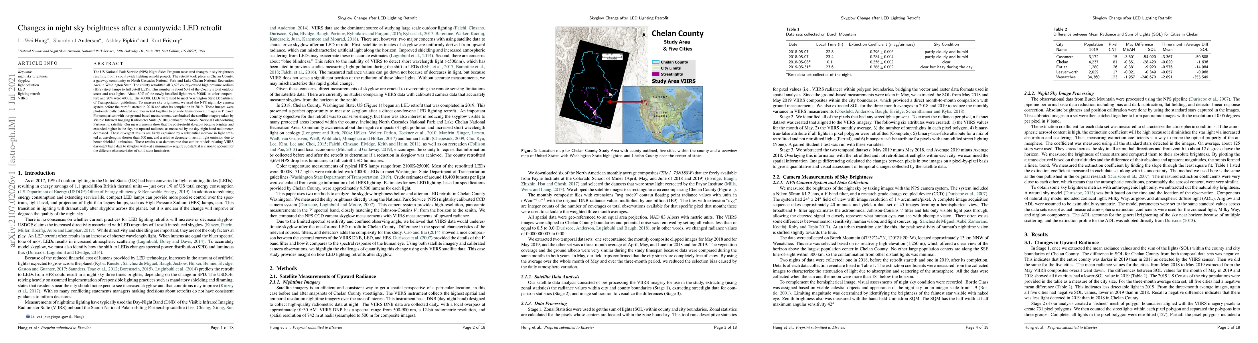 The US National Park Service (NPS) Night Skies Program measured changes in sky brightness resulting from a countywide lighting retrofit project. The retrofit took place in Chelan County, a gateway community to North Cascades National Park and Lake Chelan National Recreation Area in Washington State. The county retrofitted all 3,693 county-owned high pressure sodium (HPS) street lamps to full cutoff LEDs. This number is about 60% of the County's total outdoor street and area lights. About 80% of the newly installed lights were 3000K in color temperature and 20% were 4000K. The 4000K LEDs were used to meet Washington State Department of Transportation guidelines. To measure sky brightness, we used the NPS night sky camera system before the retrofit started in 2018 and after its completion in 2019. These images were photometrically calibrated and mosaicked together to provide hemispherical images in V band. For comparison with our ground-based measurement, we obtained the satellite imagery taken by Visible Infrared Imaging Radiometer Suite (VIIRS) onboard the Suomi National Polar-orbiting Partnership satellite. Our measurements show that the post-retrofit skyglow became brighter and extended higher in the sky, but upward radiance, as measured by the day-night band radiometer, decreased. These divergent results are likely explained by a substantial increase in light emitted at wavelengths shorter than 500 nm, and a relative decrease in zenith light emission due to better shielded luminaires. These results also demonstrate that earlier models relating VIIRS day-night band data to skyglow will, at a minimum, require substantial revision to account for the different characteristics of solid state luminaires.
