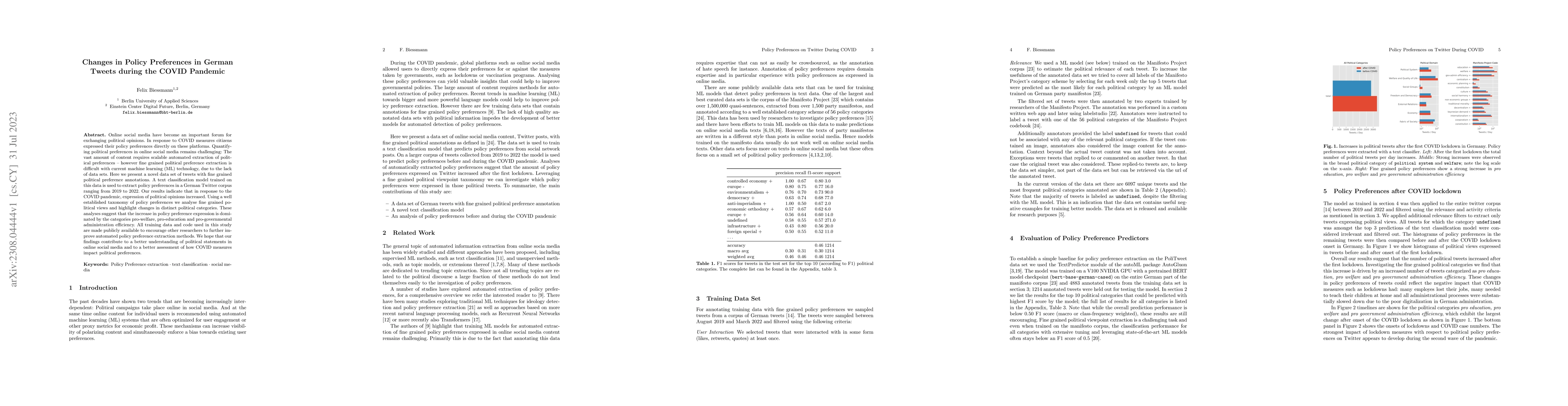 Online social media have become an important forum for exchanging political opinions. In response to COVID measures citizens expressed their policy preferences directly on these platforms. Quantifying political preferences in online social media remains challenging: The vast amount of content requires scalable automated extraction of political preferences -- however fine grained political preference extraction is difficult with current machine learning (ML) technology, due to the lack of data sets. Here we present a novel data set of tweets with fine grained political preference annotations. A text classification model trained on this data is used to extract policy preferences in a German Twitter corpus ranging from 2019 to 2022. Our results indicate that in response to the COVID pandemic, expression of political opinions increased. Using a well established taxonomy of policy preferences we analyse fine grained political views and highlight changes in distinct political categories. These analyses suggest that the increase in policy preference expression is dominated by the categories pro-welfare, pro-education and pro-governmental administration efficiency. All training data and code used in this study are made publicly available to encourage other researchers to further improve automated policy preference extraction methods. We hope that our findings contribute to a better understanding of political statements in online social media and to a better assessment of how COVID measures impact political preferences.