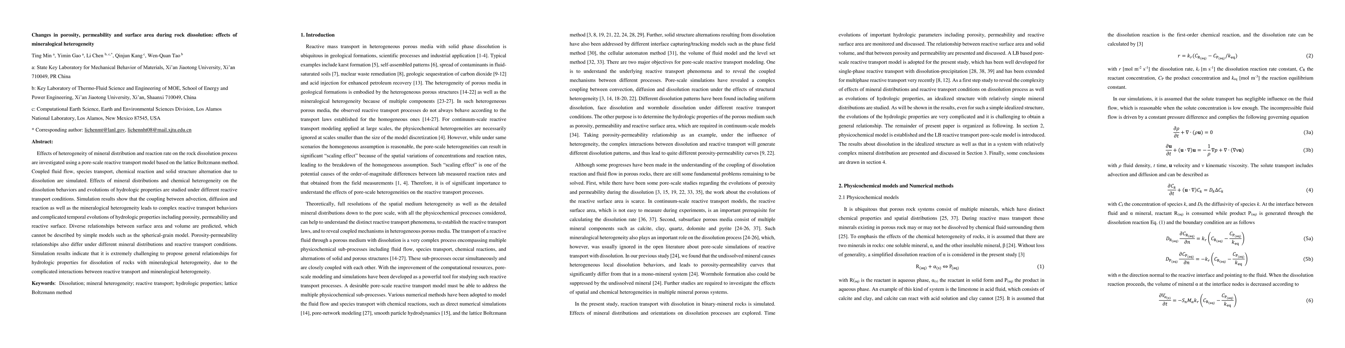 This paper investigates the impact of mineralogical heterogeneity on rock dissolution processes using a pore-scale reactive transport model, revealing complex interactions between advection, diffusion, reaction, and mineral distribution that complicate the evolution of porosity, permeability, and surface area. General relationships for hydrologic properties in heterogeneous rocks remain elusive due to these intricate interactions.
