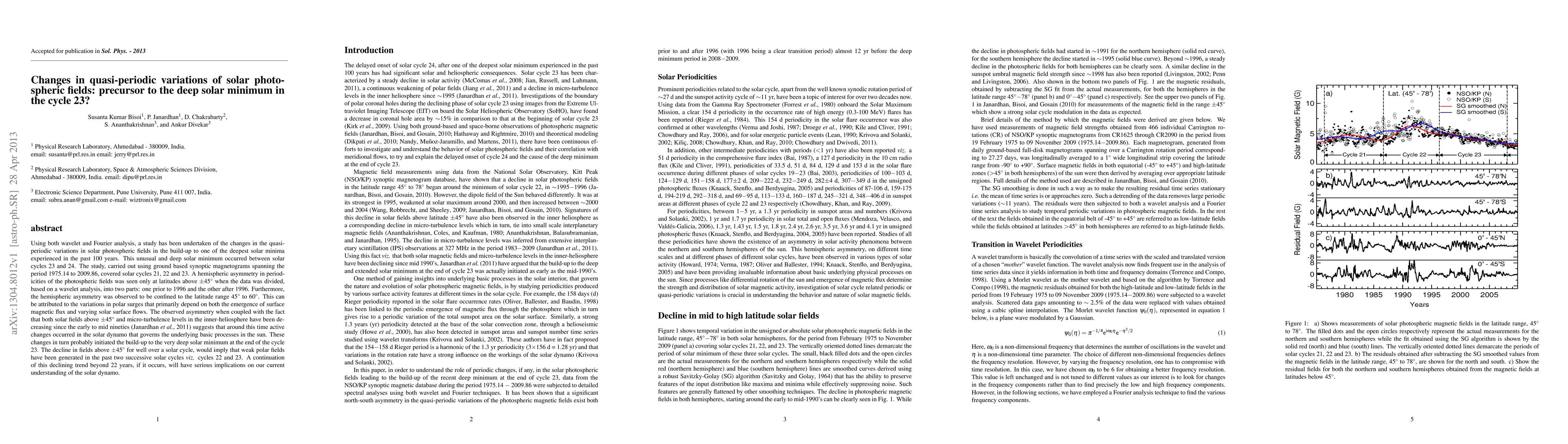 Using both wavelet and Fourier analysis, a study has been undertaken of the changes in the quasi-periodic variations in solar photospheric fields in the build-up to one of the deepest solar minima experienced in the past 100 years. This unusual and deep solar minimum occurred between solar cycles 23 and 24. The study, carried out using ground based synoptic magnetograms spanning the period 1975.14 to 2009.86, covered solar cycles 21, 22 and 23. A hemispheric asymmetry in periodicities of the photospheric fields was seen only at latitudes above $\pm45{^{\circ}}$ when the data was divided, based on a wavelet analysis, into two parts: one prior to 1996 and the other after 1996. Furthermore, the hemispheric asymmetry was observed to be confined to the latitude range 45${^{\circ}}$ to 60${^{\circ}}$. This can be attributed to the variations in polar surges that primarily depend on both the emergence of surface magnetic flux and varying solar surface flows. The observed asymmetry when coupled with the fact that both solar fields above $\pm45{^{\circ}}$ and micro-turbulence levels in the inner-heliosphere have been decreasing since the early to mid nineties (Janardhan et al., 2011) suggests that around this time active changes occurred in the solar dynamo that governs the underlying basic processes in the sun. These changes in turn probably initiated the build-up to the very deep solar minimum at the end of the cycle 23. The decline in fields above $\pm45{^{\circ}}$ for well over a solar cycle, would imply that weak polar fields have been generated in the past two successive solar cycles \textit{viz.} cycles 22 and 23. A continuation of this declining trend beyond 22 years, if it occurs, will have serious implications on our current understanding of the solar dynamo.