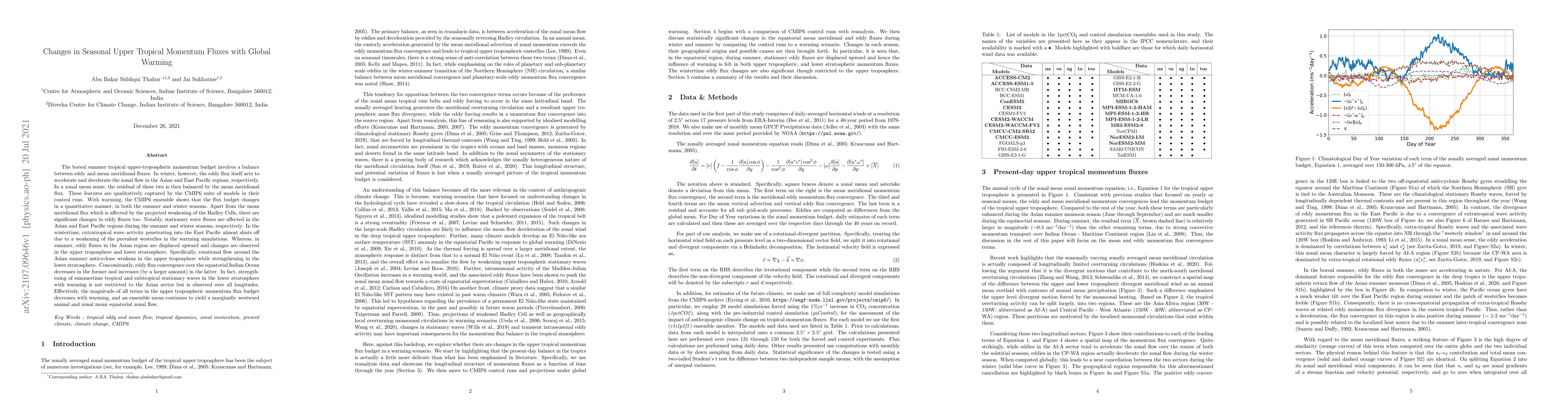 The CMIP6 models show changes in the upper tropical momentum flux budget with global warming, particularly affecting eddy and mean meridional fluxes. Warming leads to significant shifts in stationary wave fluxes and a weakening of westerlies, altering the momentum balance in both summer and winter.
