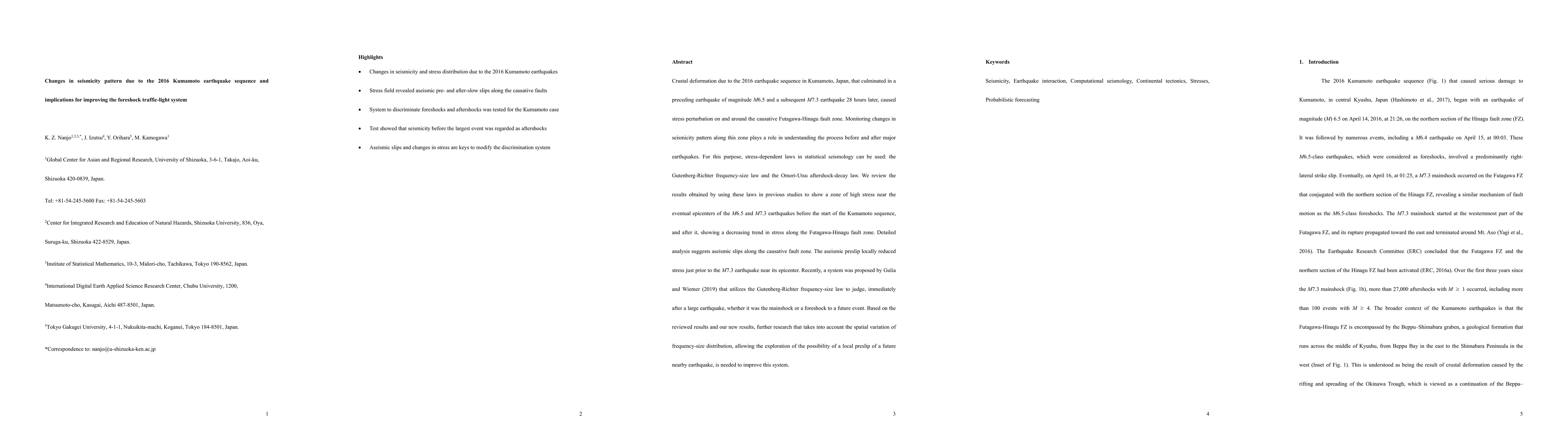 The 2016 Kumamoto earthquake sequence analysis reveals stress perturbations along the Futagawa-Hinagu fault, indicating aseismic slips prior to major earthquakes. Utilizing Gutenberg-Richter and Omori-Utsu laws, the study suggests improvements for a foreshock traffic-light system by considering spatial variations in seismic frequency-size distribution.