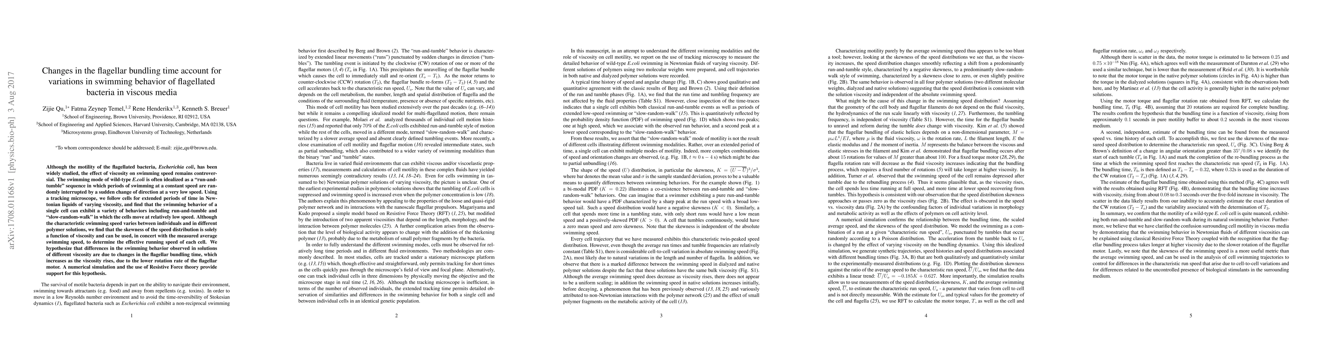 This study found that flagellated bacteria in viscous media exhibit varied swimming behaviors due to changes in flagellar bundling time, which is affected by viscosity. The researchers used tracking microscopy and numerical simulations to understand the relationship between viscosity and swimming behavior.