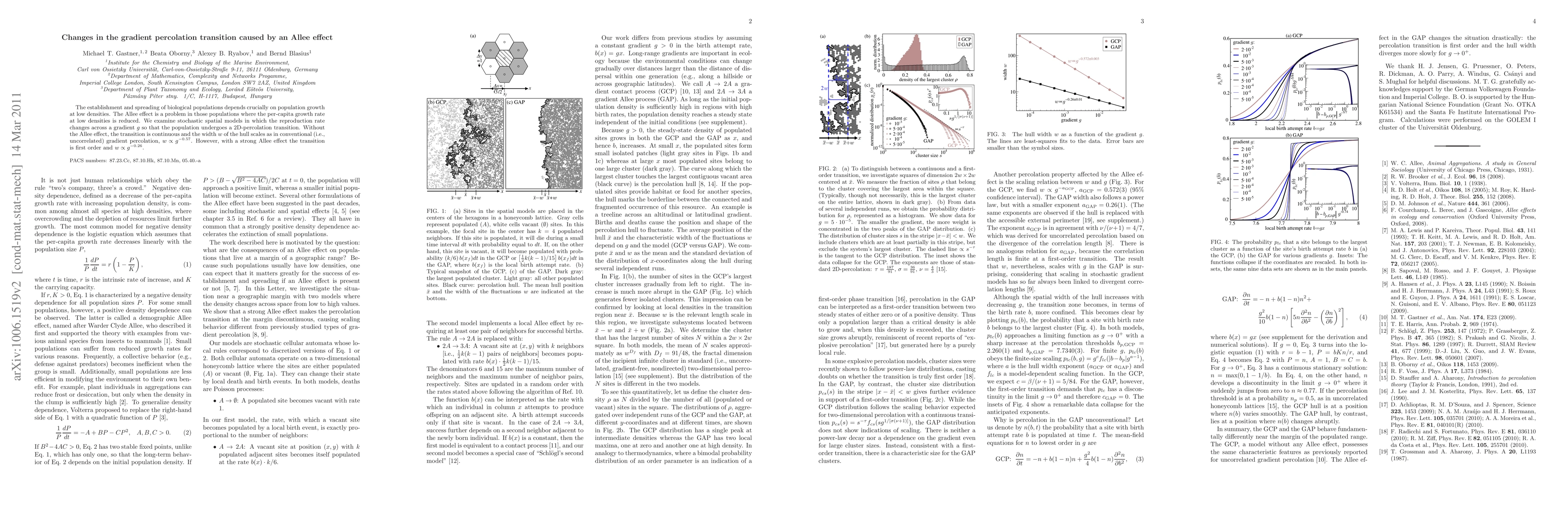 The establishment and spreading of biological populations depends crucially on population growth at low densities. The Allee effect is a problem in those populations where the per-capita growth rate at low densities is reduced. We examine stochastic spatial models in which the reproduction rate changes across a gradient g so that the population undergoes a 2D-percolation transition. Without the Allee effect, the transition is continuous and the width w of the hull scales as in conventional (i.e., uncorrelated) gradient percolation, proportional to g^(-0.57). However, with a strong Allee effect the transition is first order and w is proportional to g^(-0.26).