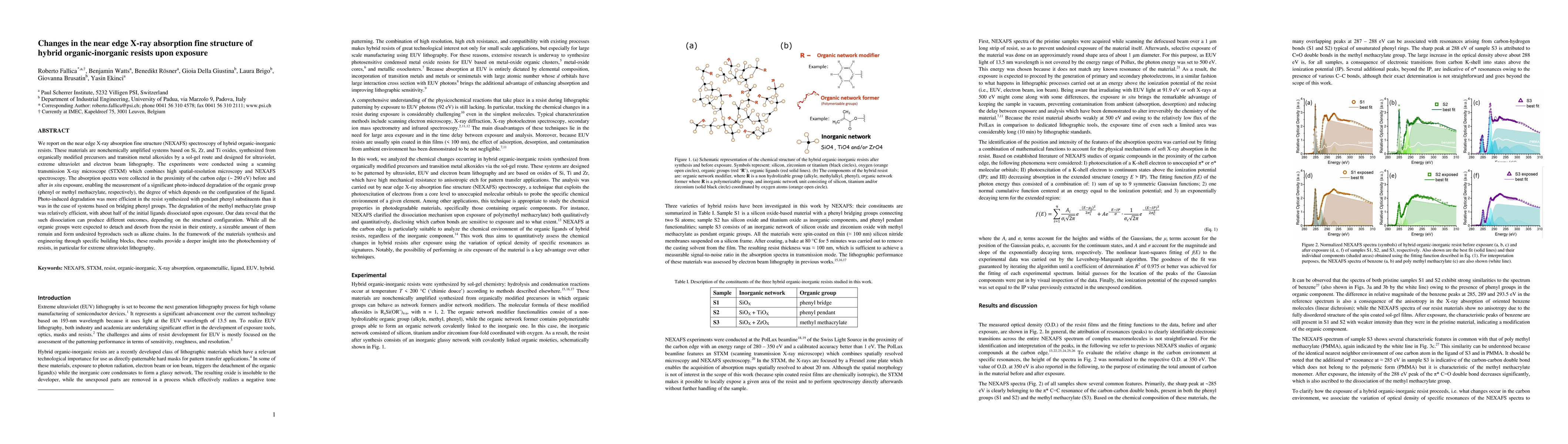 We report on the near edge X-ray absorption fine structure (NEXAFS) spectroscopy of hybrid organic-inorganic resists. These materials are nonchemically amplified systems based on Si, Zr, and Ti oxides, synthesized from organically modified precursors and transition metal alkoxides by a sol-gel route and designed for ultraviolet, extreme ultraviolet and electron beam lithography. The experiments were conducted using a scanning transmission X-ray microscope (STXM) which combines high spatial-resolution microscopy and NEXAFS spectroscopy. The absorption spectra were collected in the proximity of the carbon edge (~ 290 eV) before and after in situ exposure, enabling the measurement of a significant photo-induced degradation of the organic group (phenyl or methyl methacrylate, respectively), the degree of which depends on the configuration of the ligand. Photo-induced degradation was more efficient in the resist synthesized with pendant phenyl substituents than it was in the case of systems based on bridging phenyl groups. The degradation of the methyl methacrylate group was relatively efficient, with about half of the initial ligands dissociated upon exposure. Our data reveal that the such dissociation can produce different outcomes, depending on the structural configuration. While all the organic groups were expected to detach and desorb from the resist in their entirety, a sizeable amount of them remain and form undesired byproducts such as alkene chains. In the framework of the materials synthesis and engineering through specific building blocks, these results provide a deeper insight into the photochemistry of resists, in particular for extreme ultraviolet lithography.