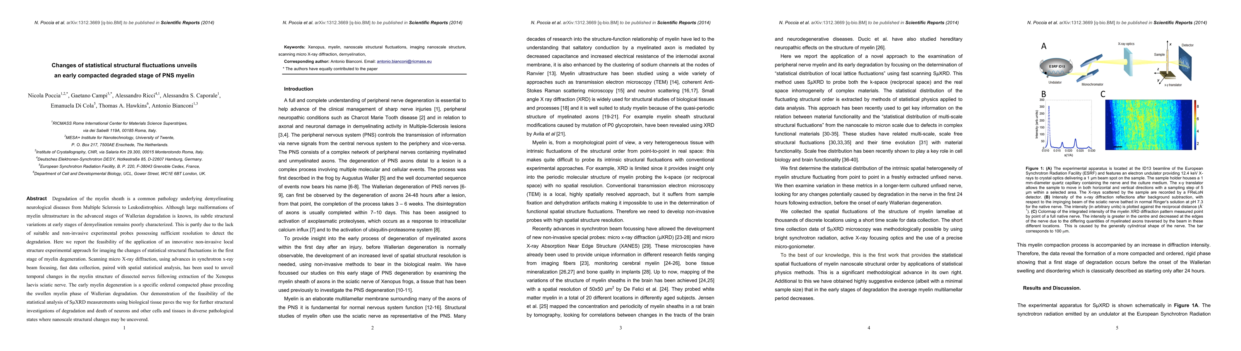 Degradation of the myelin sheath is a common pathology underlying demyelinating neurological diseases from Multiple Sclerosis to Leukodistrophies. Although large malformations of myelin ultrastructure in the advanced stages of Wallerian degradation is known, its subtle structural variations at early stages of demyelination remains poorly characterized. This is partly due to the lack of suitable and non-invasive experimental probes possessing sufficient resolution to detect the degradation. Here we report the feasibility of the application of an innovative non-invasive local structure experimental approach for imaging the changes of statistical structural fluctuations in the first stage of myelin degeneration. Scanning micro X-ray diffraction, using advances in synchrotron x-ray beam focusing, fast data collection, paired with spatial statistical analysis, has been used to unveil temporal changes in the myelin structure of dissected nerves following extraction of the Xenopus laevis sciatic nerve. The early myelin degeneration is a specific ordered compacted phase preceding the swollen myelin phase of Wallerian degradation. Our demonstration of the feasibility of the statistical analysis of SmXRD measurements using biological tissue paves the way for further structural investigations of degradation and death of neurons and other cells and tissues in diverse pathological states where nanoscale structural changes may be uncovered.