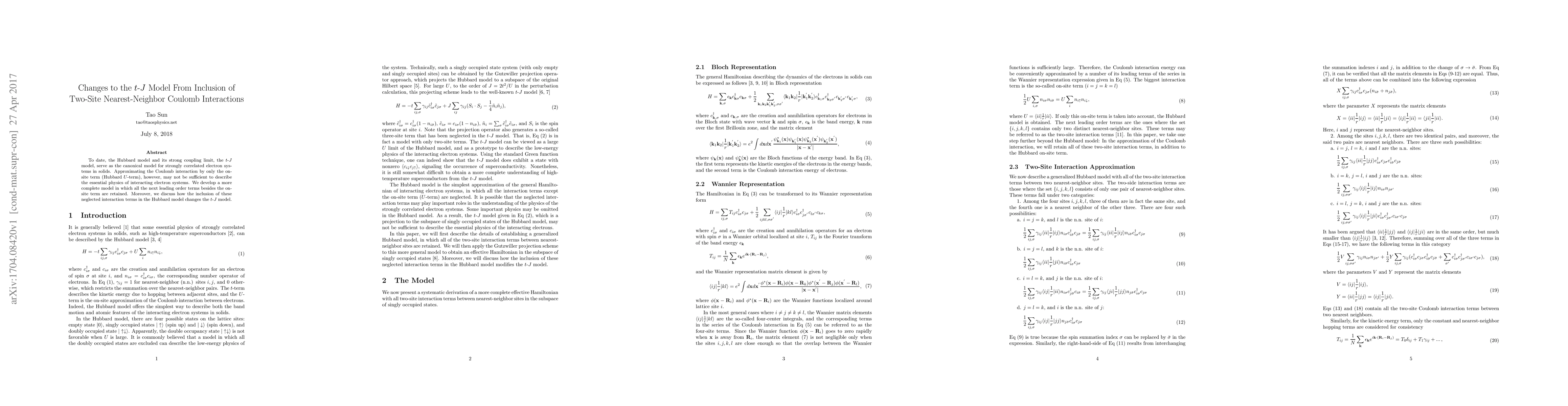 This paper develops a refined t-J model by including two-site nearest-neighbor Coulomb interactions beyond the traditional on-site Hubbard U-term. It explores how these additional interactions modify the essential physics of strongly correlated electron systems in solids.