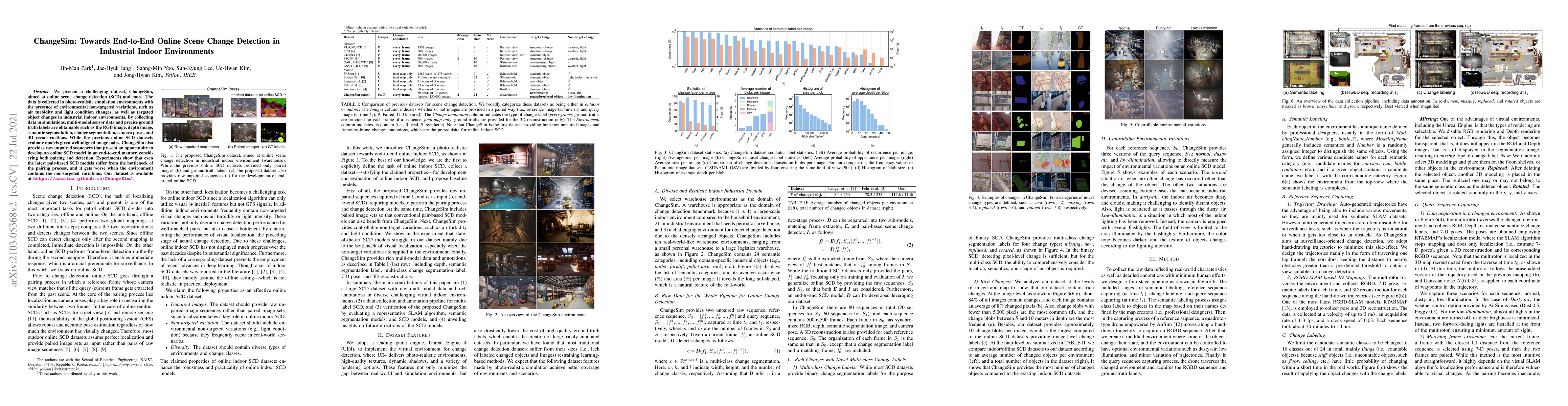 We present a challenging dataset, ChangeSim, aimed at online scene change detection (SCD) and more. The data is collected in photo-realistic simulation environments with the presence of environmental non-targeted variations, such as air turbidity and light condition changes, as well as targeted object changes in industrial indoor environments. By collecting data in simulations, multi-modal sensor data and precise ground truth labels are obtainable such as the RGB image, depth image, semantic segmentation, change segmentation, camera poses, and 3D reconstructions. While the previous online SCD datasets evaluate models given well-aligned image pairs, ChangeSim also provides raw unpaired sequences that present an opportunity to develop an online SCD model in an end-to-end manner, considering both pairing and detection. Experiments show that even the latest pair-based SCD models suffer from the bottleneck of the pairing process, and it gets worse when the environment contains the non-targeted variations. Our dataset is available at http://sammica.github.io/ChangeSim/.