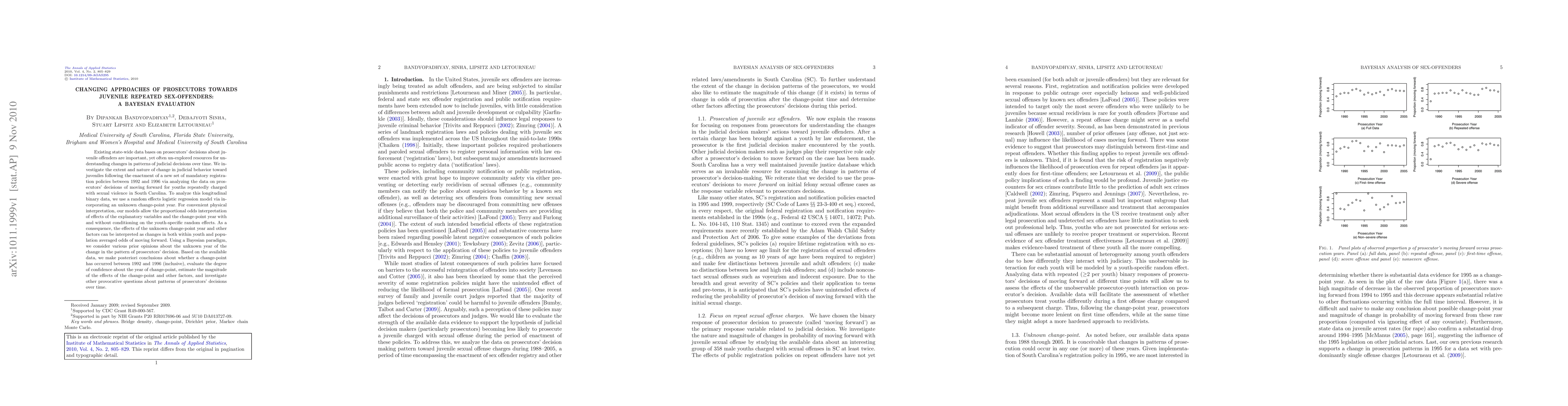 Existing state-wide data bases on prosecutors' decisions about juvenile offenders are important, yet often un-explored resources for understanding changes in patterns of judicial decisions over time. We investigate the extent and nature of change in judicial behavior toward juveniles following the enactment of a new set of mandatory registration policies between 1992 and 1996 via analyzing the data on prosecutors' decisions of moving forward for youths repeatedly charged with sexual violence in South Carolina. To analyze this longitudinal binary data, we use a random effects logistic regression model via incorporating an unknown change-point year. For convenient physical interpretation, our models allow the proportional odds interpretation of effects of the explanatory variables and the change-point year with and without conditioning on the youth-specific random effects. As a consequence, the effects of the unknown change-point year and other factors can be interpreted as changes in both within youth and population averaged odds of moving forward. Using a Bayesian paradigm, we consider various prior opinions about the unknown year of the change in the pattern of prosecutors' decision. Based on the available data, we make posteriori conclusions about whether a change-point has occurred between 1992 and 1996 (inclusive), evaluate the degree of confidence about the year of change-point, estimate the magnitude of the effects of the change-point and other factors, and investigate other provocative questions about patterns of prosecutors' decisions over time.