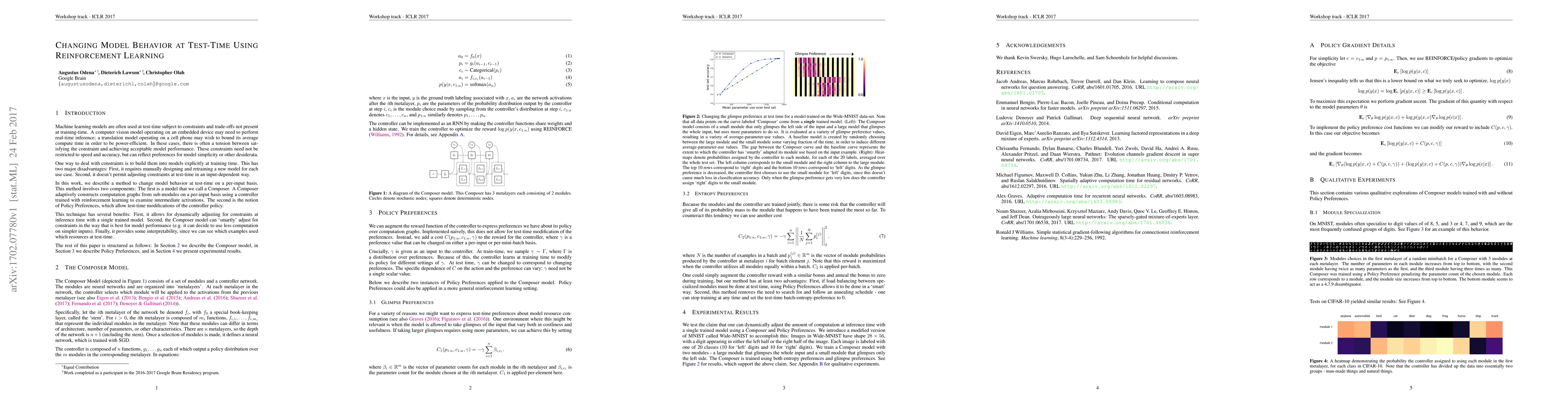 Machine learning models are often used at test-time subject to constraints and trade-offs not present at training-time. For example, a computer vision model operating on an embedded device may need to perform real-time inference, or a translation model operating on a cell phone may wish to bound its average compute time in order to be power-efficient. In this work we describe a mixture-of-experts model and show how to change its test-time resource-usage on a per-input basis using reinforcement learning. We test our method on a small MNIST-based example.