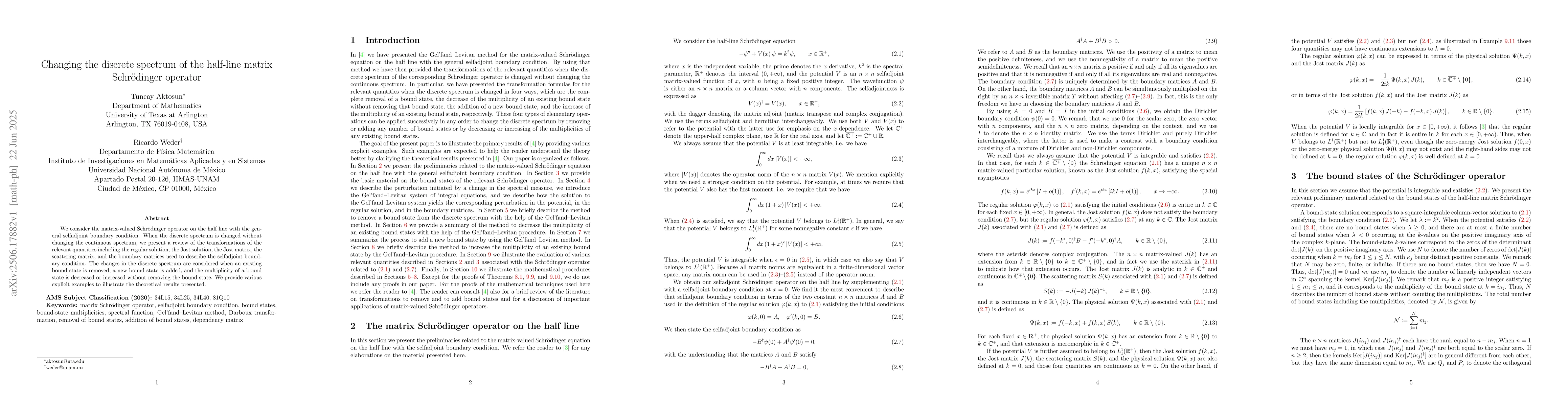 We consider the matrix-valued Schr\"odinger operator on the half line with the general selfadjoint boundary condition. When the discrete spectrum is changed without changing the continuous spectrum, we present a review of the transformations of the relevant quantities including the regular solution, the Jost solution, the Jost matrix, the scattering matrix, and the boundary matrices used to describe the selfadjoint boundary condition. The changes in the discrete spectrum are considered when an existing bound state is removed, a new bound state is added, and the multiplicity of a bound state is decreased or increased without removing the bound state. We provide various explicit examples to illustrate the theoretical resultspresented.