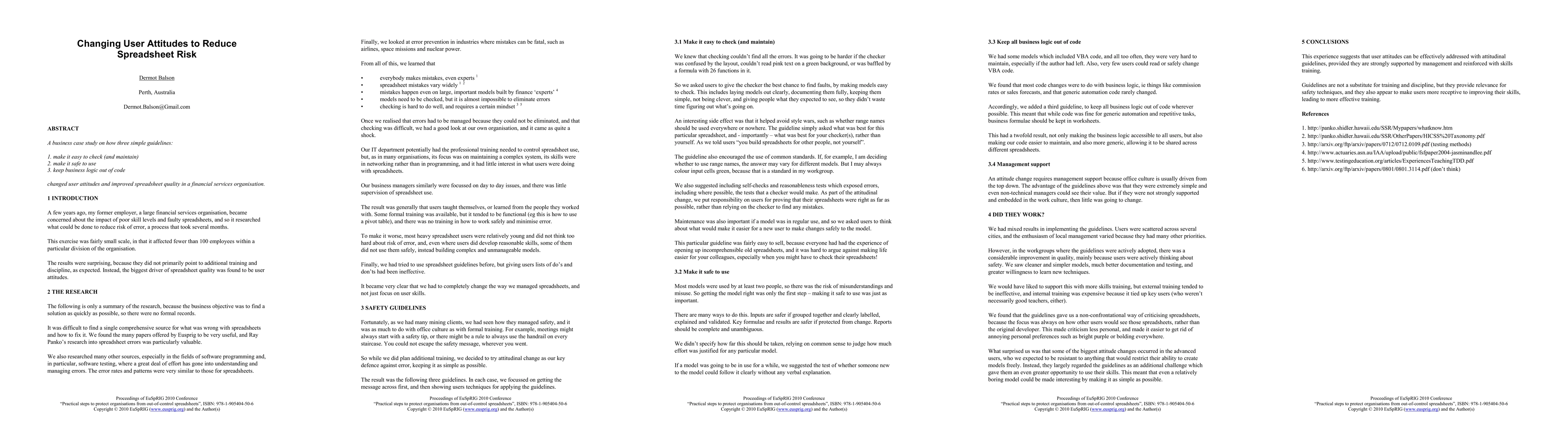 A business case study on how three simple guidelines: 1. Make it easy to check (and maintain) 2. Make it safe to use 3. Keep business logic out of code changed user attitudes and improved spreadsheet quality in a financial services organisation.