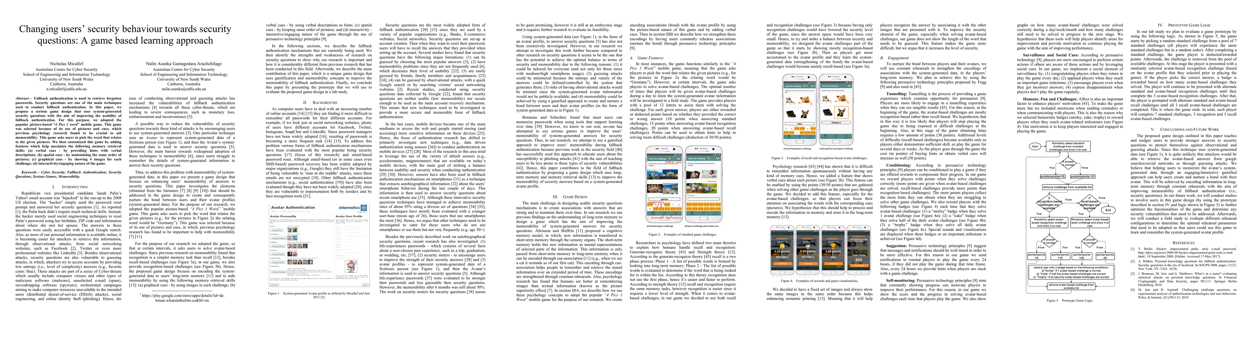 This paper proposes a serious game based on "4 Pics 1 Word" to improve security question memorability for fallback authentication. The game incorporates verbal, spatial, and graphical cues, along with interactive elements, to enhance users' security behavior.