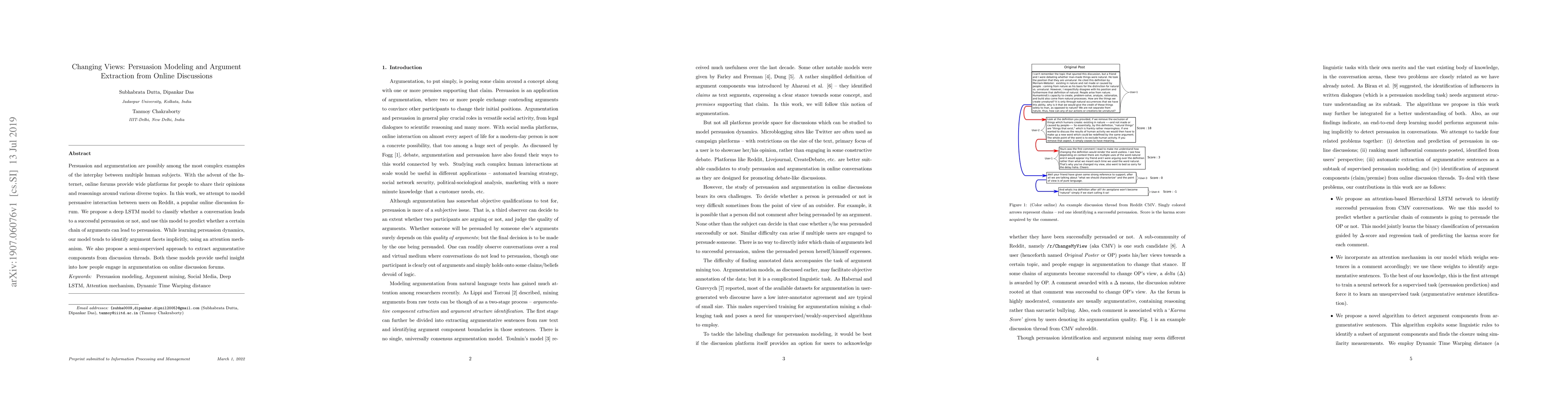 This paper models persuasive interactions on Reddit using a deep LSTM model to classify successful persuasion and an attention mechanism to identify argument facets. It also proposes a semi-supervised approach for extracting argumentative components from discussion threads, offering insights into online argumentation dynamics.