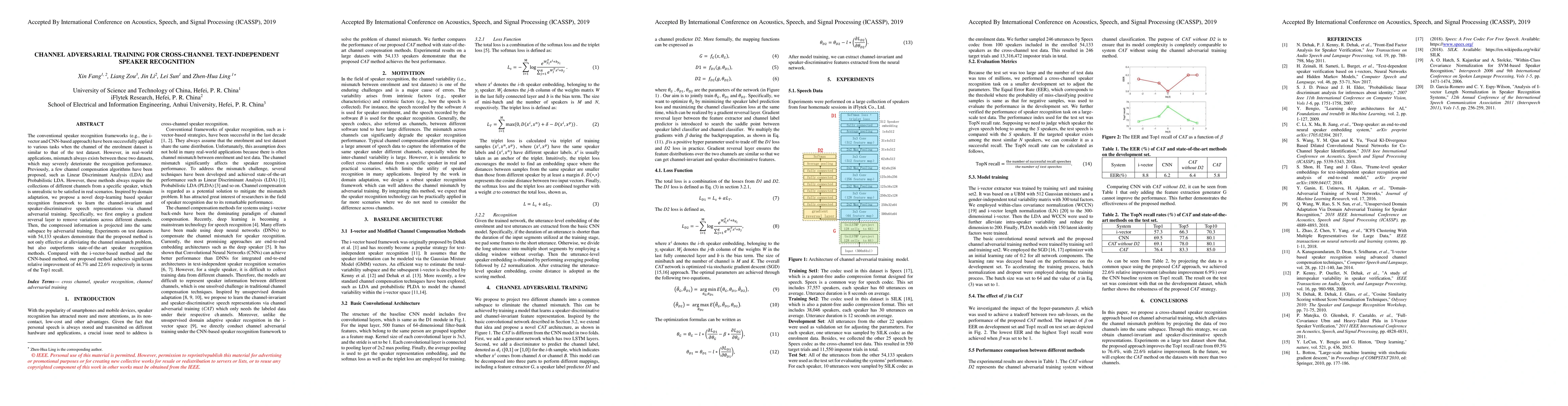 This paper proposes a novel deep-learning framework for cross-channel text-independent speaker recognition using channel adversarial training to learn channel-invariant and speaker-discriminative speech representations. The method achieves significant improvements over state-of-the-art techniques, demonstrating a 44.7% relative improvement over i-vector-based methods and a 22.6% improvement over CNN-based methods.