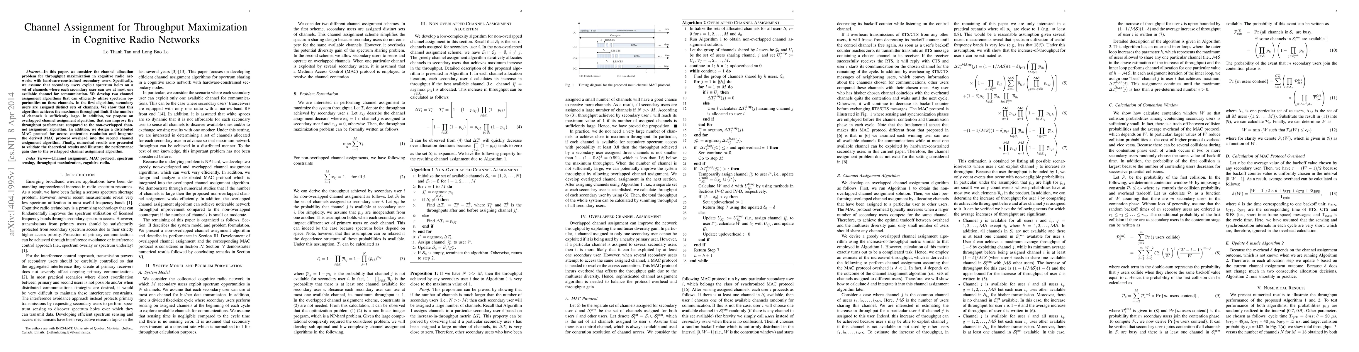 The paper develops two channel assignment algorithms for throughput maximization in cognitive radio networks with hardware-constrained secondary users. It considers spectrum holes on a set of channels, allowing each secondary user to use at most one available channel for communication.