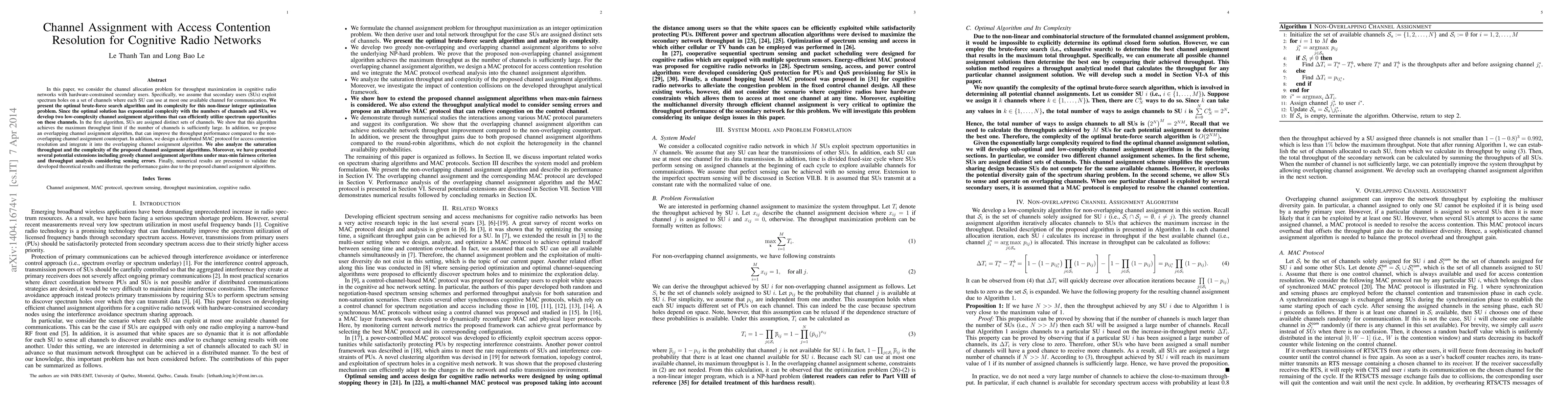 This paper addresses the channel assignment problem for cognitive radio networks with hardware-constrained secondary users, proposing optimal and low-complexity algorithms for efficient spectrum hole utilization. It introduces a distributed MAC protocol for access contention resolution and analyzes the throughput and complexity of the proposed algorithms.