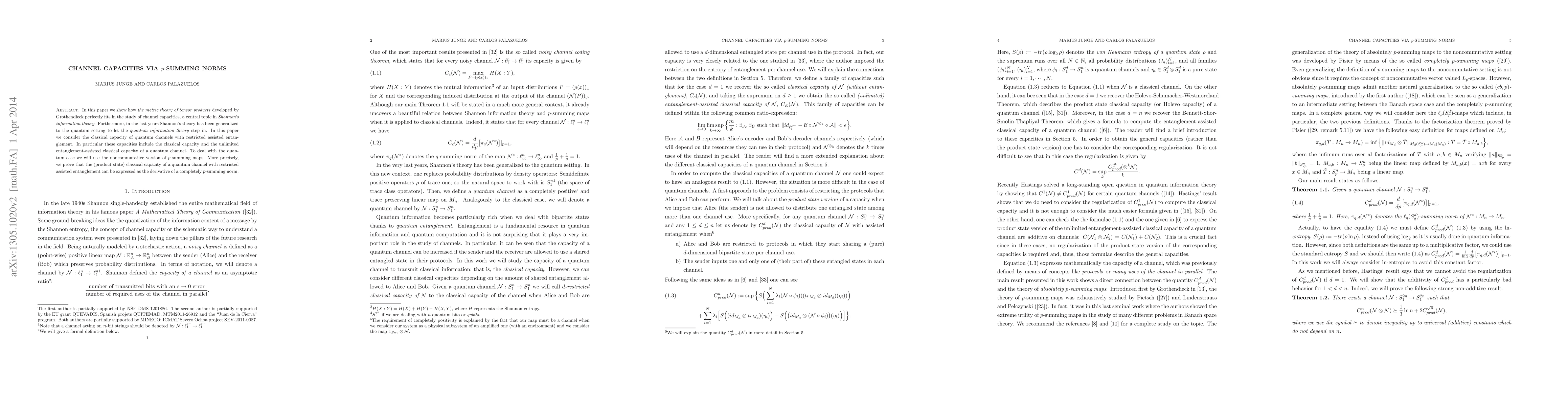 In this paper we show how \emph{the metric theory of tensor products} developed by Grothendieck perfectly fits in the study of channel capacities, a central topic in \emph{Shannon's information theory}. Furthermore, in the last years Shannon's theory has been generalized to the quantum setting to let the \emph{quantum information theory} step in. In this paper we consider the classical capacity of quantum channels with restricted assisted entanglement. In particular these capacities include the classical capacity and the unlimited entanglement-assisted classical capacity of a quantum channel. To deal with the quantum case we will use the noncommutative version of $p$-summing maps. More precisely, we prove that the (product state) classical capacity of a quantum channel with restricted assisted entanglement can be expressed as the derivative of a completely $p$-summing norm.