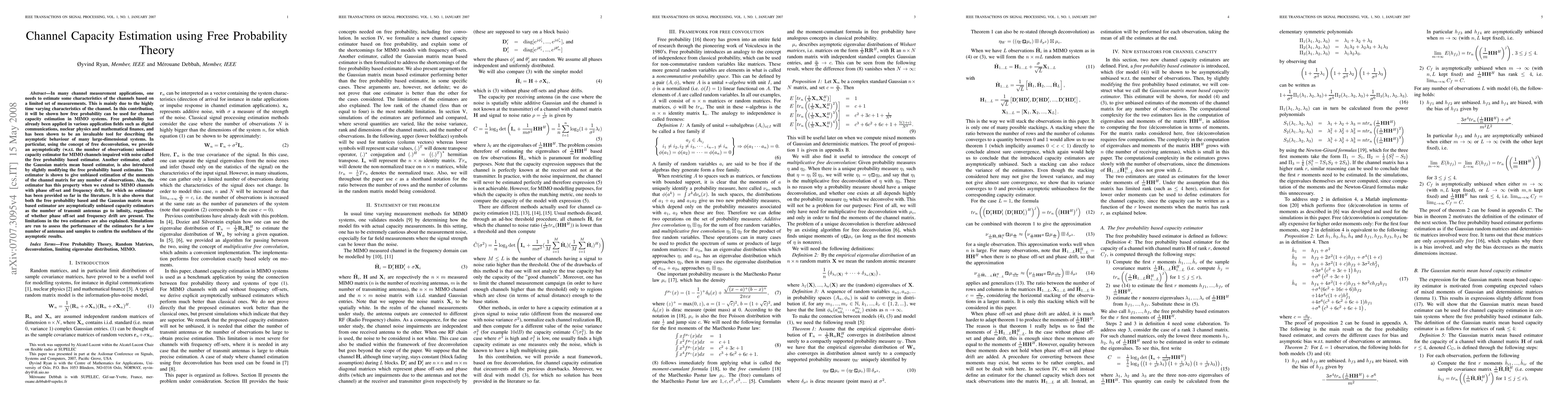 In many channel measurement applications, one needs to estimate some characteristics of the channels based on a limited set of measurements. This is mainly due to the highly time varying characteristics of the channel. In this contribution, it will be shown how free probability can be used for channel capacity estimation in MIMO systems. Free probability has already been applied in various application fields such as digital communications, nuclear physics and mathematical finance, and has been shown to be an invaluable tool for describing the asymptotic behaviour of many large-dimensional systems. In particular, using the concept of free deconvolution, we provide an asymptotically (w.r.t. the number of observations) unbiased capacity estimator for MIMO channels impaired with noise called the free probability based estimator. Another estimator, called the Gaussian matrix mean based estimator, is also introduced by slightly modifying the free probability based estimator. This estimator is shown to give unbiased estimation of the moments of the channel matrix for any number of observations. Also, the estimator has this property when we extend to MIMO channels with phase off-set and frequency drift, for which no estimator has been provided so far in the literature. It is also shown that both the free probability based and the Gaussian matrix mean based estimator are asymptotically unbiased capacity estimators as the number of transmit antennas go to infinity, regardless of whether phase off-set and frequency drift are present. The limitations in the two estimators are also explained. Simulations are run to assess the performance of the estimators for a low number of antennas and samples to confirm the usefulness of the asymptotic results.