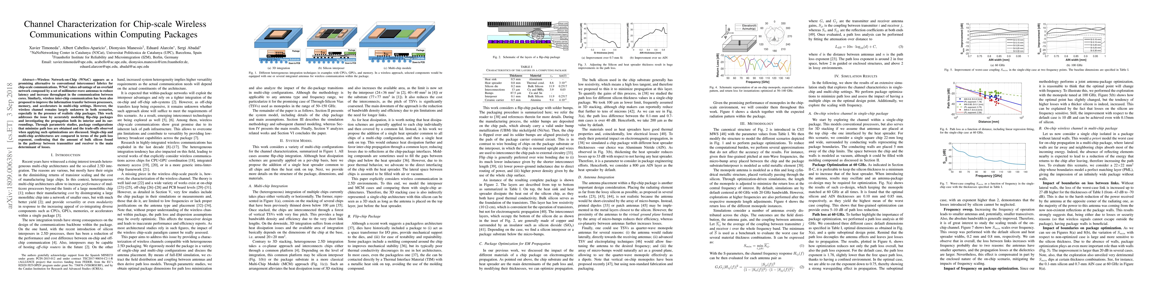 This paper investigates the wireless channel characteristics for chip-scale communications within computing packages, focusing on minimizing path loss through accurate modeling of flip-chip packages. It compares single-chip and multi-chip architectures to determine the impact of bulk silicon on path loss exponent.