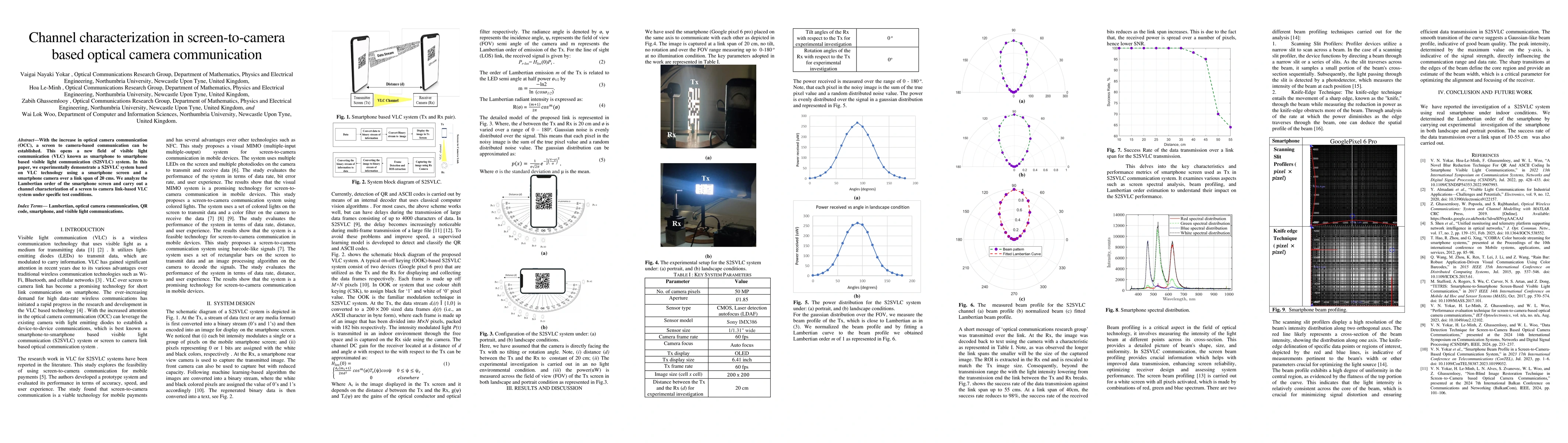 With the increase in optical camera communication (OCC), a screen to camera-based communication can be established. This opens a new field of visible light communication (VLC) known as smartphone to smartphone based visible light communication (S2SVLC) system. In this paper, we experimentally demonstrate a S2SVLC system based on VLC technology using a smartphone screen and a smartphone camera over a link span of 20 cms. We analyze the Lambertian order of the smartphone screen and carry out a channel characterization of a screen to camera link-based VLC system under specific test conditions.