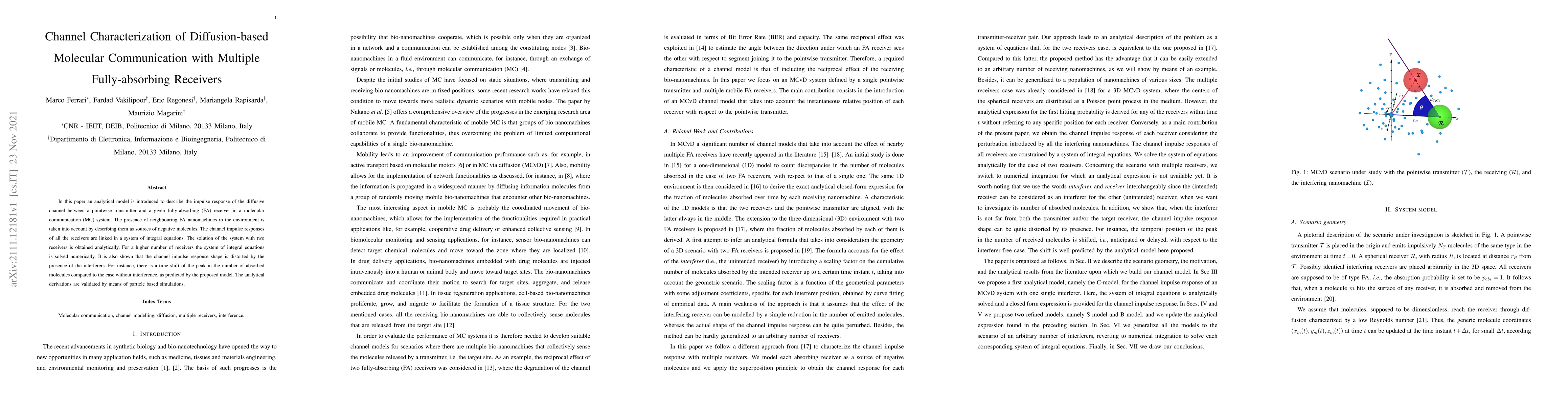 In this paper an analytical model is introduced to describe the impulse response of the diffusive channel between a pointwise transmitter and a given fully-absorbing (FA) receiver in a molecular communication (MC) system. The presence of neighbouring FA nanomachines in the environment is taken into account by describing them as sources of negative molecules. The channel impulse responses of all the receivers are linked in a system of integral equations. The solution of the system with two receivers is obtained analytically. For a higher number of receivers the system of integral equations is solved numerically. It is also shown that the channel impulse response shape is distorted by the presence of the interferers. For instance, there is a time shift of the peak in the number of absorbed molecules compared to the case without interference, as predicted by the proposed model. The analytical derivations are validated by means of particle based simulations.