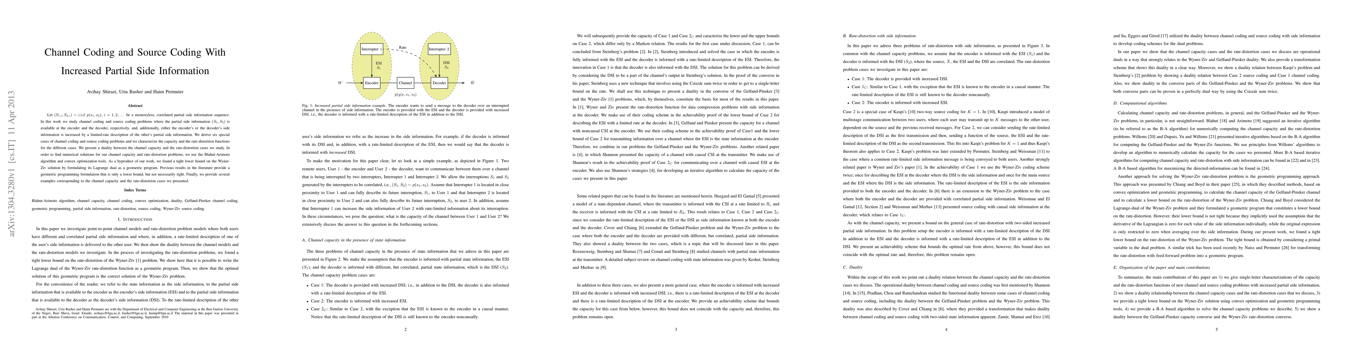 Let (S1,i, S2,i), distributed according to i.i.d p(s1, s2), i = 1, 2, . . . be a memoryless, correlated partial side information sequence. In this work we study channel coding and source coding problems where the partial side information (S1, S2) is available at the encoder and the decoder, respectively, and, additionally, either the encoder's or the decoder's side information is increased by a limited-rate description of the other's partial side information. We derive six special cases of channel coding and source coding problems and we characterize the capacity and the rate-distortion functions for the different cases. We present a duality between the channel capacity and the rate-distortion cases we study. In order to find numerical solutions for our channel capacity and rate-distortion problems, we use the Blahut-Arimoto algorithm and convex optimization tools. As a byproduct of our work, we found a tight lower bound on the Wyner-Ziv solution by formulating its Lagrange dual as a geometric program. Previous results in the literature provide a geometric programming formulation that is only a lower bound, but not necessarily tight. Finally, we provide several examples corresponding to the channel capacity and the rate-distortion cases we presented.