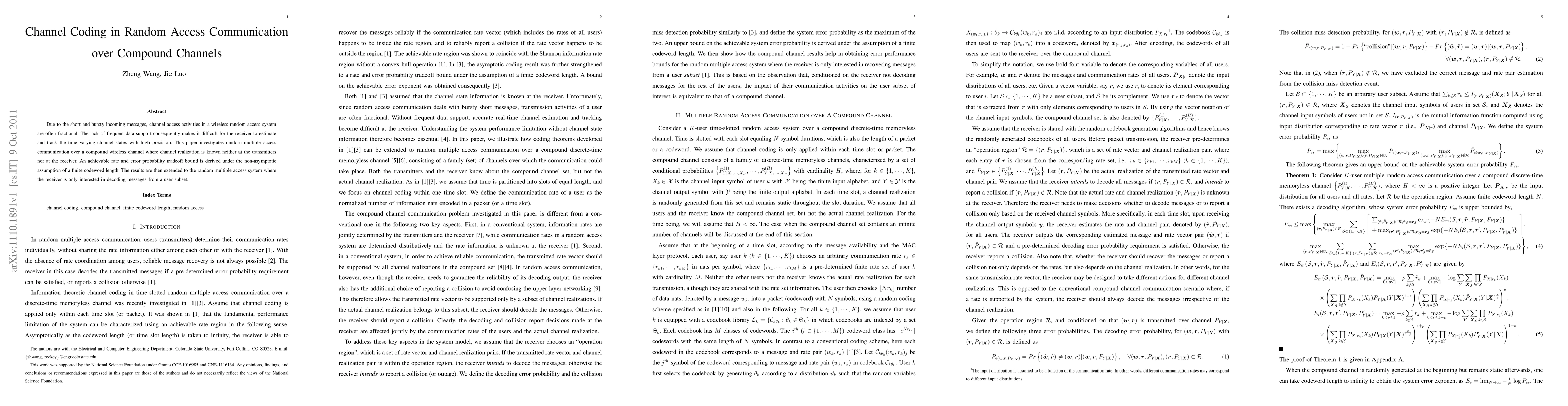 This paper explores channel coding for random access communication over compound wireless channels, deriving an achievable rate and error probability tradeoff under finite codeword length. It extends the results to random multiple access systems focusing on decoding messages from a subset of users.
