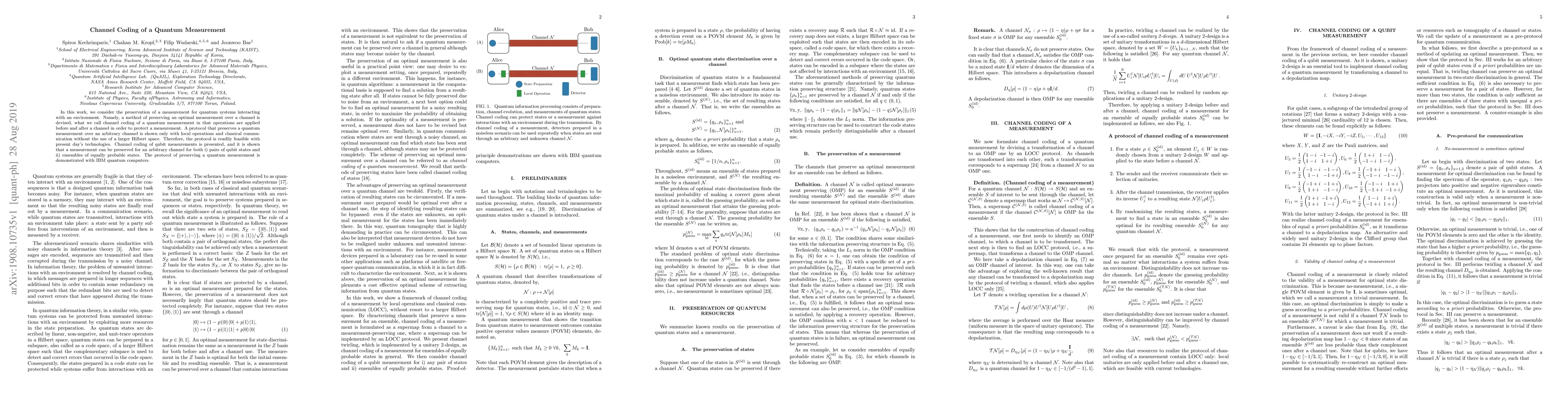 In this work, we consider the preservation of a measurement for quantum systems interacting with an environment. Namely, a method of preserving an optimal measurement over a channel is devised, what we call channel coding of a quantum measurement in that operations are applied before and after a channel in order to protect a measurement. A protocol that preserves a quantum measurement over an arbitrary channel is shown only with local operations and classical communication without the use of a larger Hilbert space. Therefore, the protocol is readily feasible with present day's technologies. Channel coding of qubit measurements is presented, and it is shown that a measurement can be preserved for an arbitrary channel for both i) pairs of qubit states and ii) ensembles of equally probable states. The protocol of preserving a quantum measurement is demonstrated with IBM quantum computers.