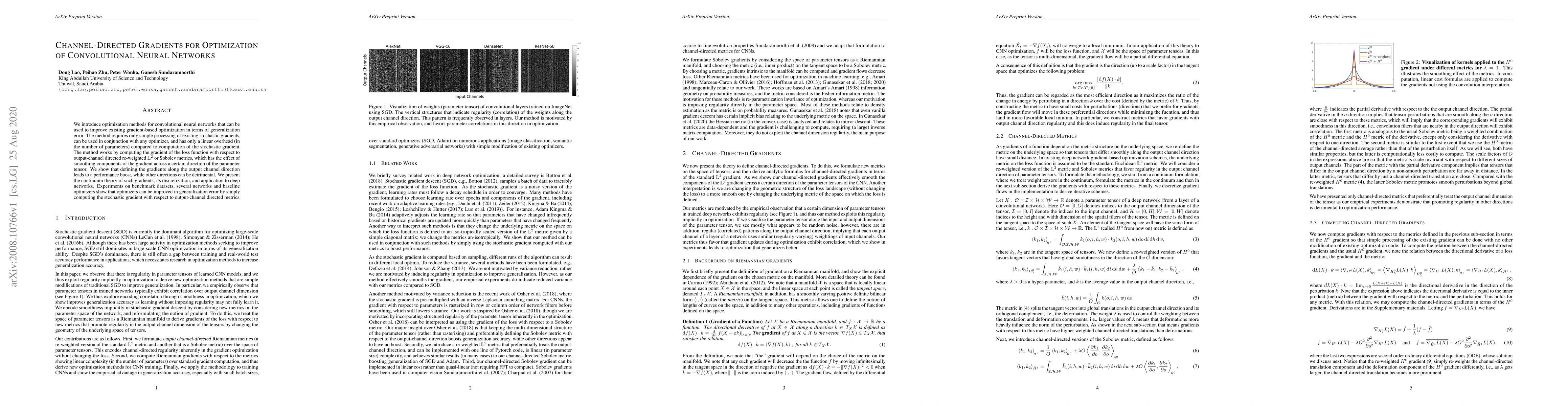 We introduce optimization methods for convolutional neural networks that can be used to improve existing gradient-based optimization in terms of generalization error. The method requires only simple processing of existing stochastic gradients, can be used in conjunction with any optimizer, and has only a linear overhead (in the number of parameters) compared to computation of the stochastic gradient. The method works by computing the gradient of the loss function with respect to output-channel directed re-weighted L2 or Sobolev metrics, which has the effect of smoothing components of the gradient across a certain direction of the parameter tensor. We show that defining the gradients along the output channel direction leads to a performance boost, while other directions can be detrimental. We present the continuum theory of such gradients, its discretization, and application to deep networks. Experiments on benchmark datasets, several networks and baseline optimizers show that optimizers can be improved in generalization error by simply computing the stochastic gradient with respect to output-channel directed metrics.