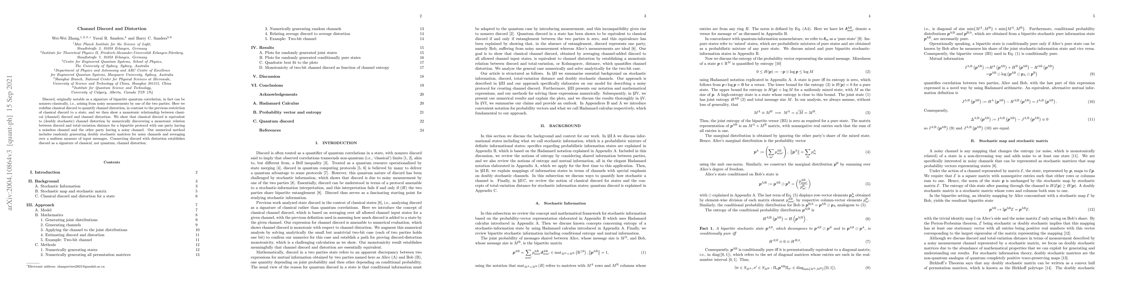 Discord, originally notable as a signature of bipartite quantum correlation,in fact can be nonzero classically, i.e., arising from noisy measurements by one of the two parties. Here we redefine classical discord to quantify channel distortion,in contrast to the previous restriction of classical discord to a state,and we then show a monotonic relationship between classical (channel) discord and channel distortion. We show that classical discord is equivalent to (doubly stochastic) channel distortion by numerically discovering a monotonic relation between discord and total-variation distance for a bipartite protocol with one party having a noiseless channel and the other party having a noisy channel. Our numerical method includes randomly generating doubly stochastic matrices for noisy channels and averaging over a uniform measure of input messages. Connecting discord with distortion establishes discord as a signature of classical, not quantum, channel distortion.